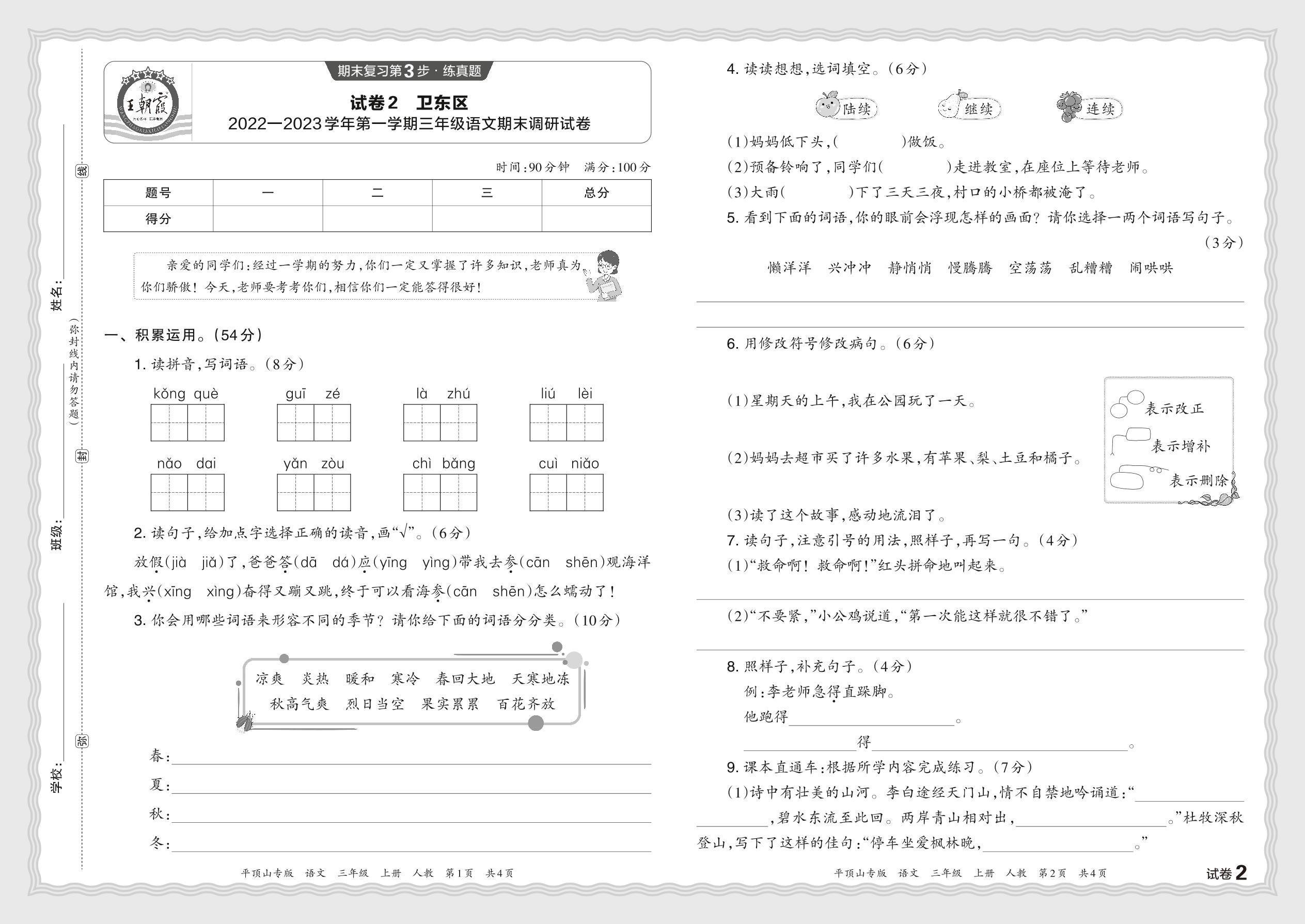 河南省平顶山市卫东区2022—2023学年第一学期三年级语文期末调研试卷(人教版)【2】