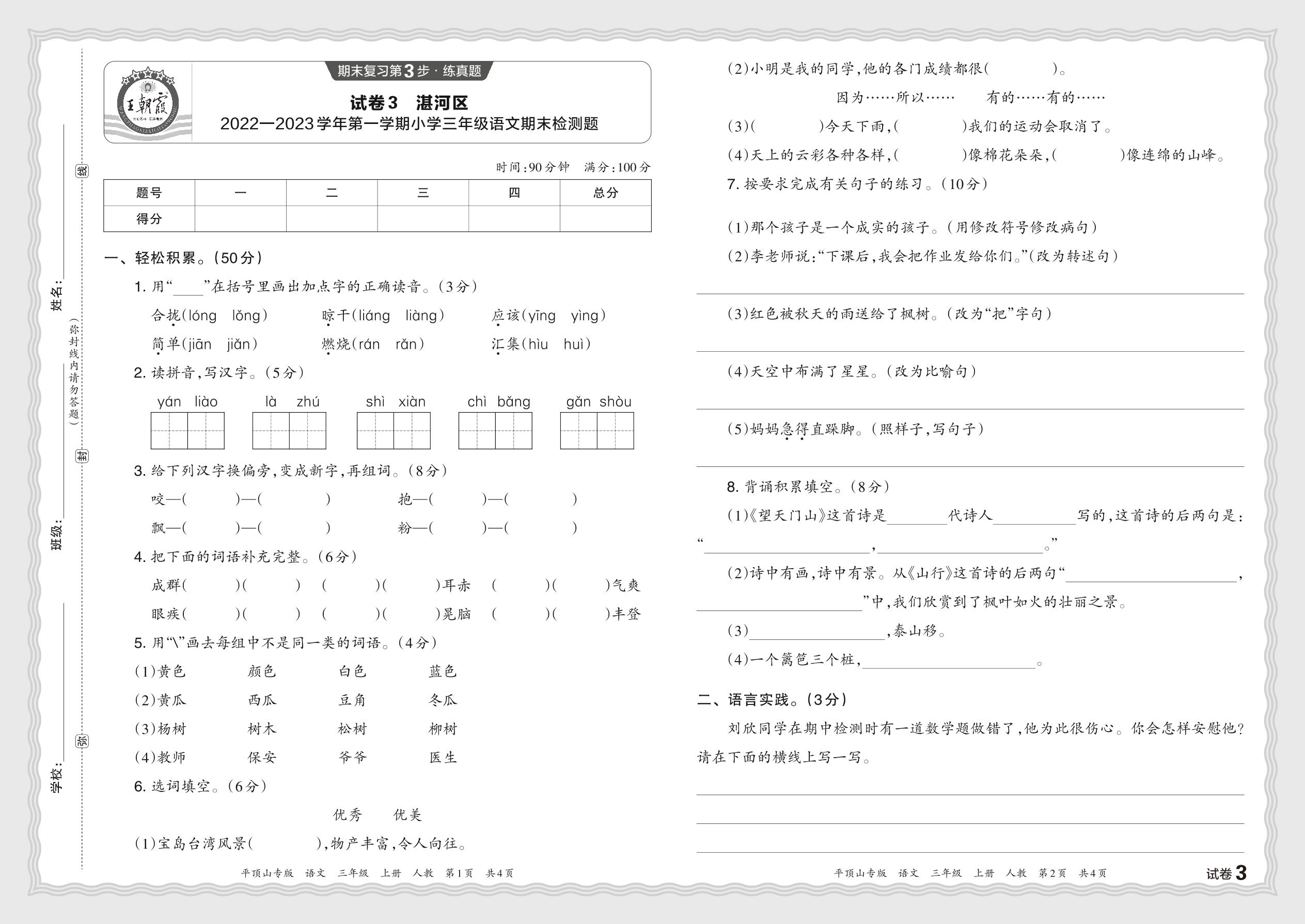 河南省平顶山市湛河区2022—2023学年第一学期小学三年级语文期末检测题(人教版)【3】