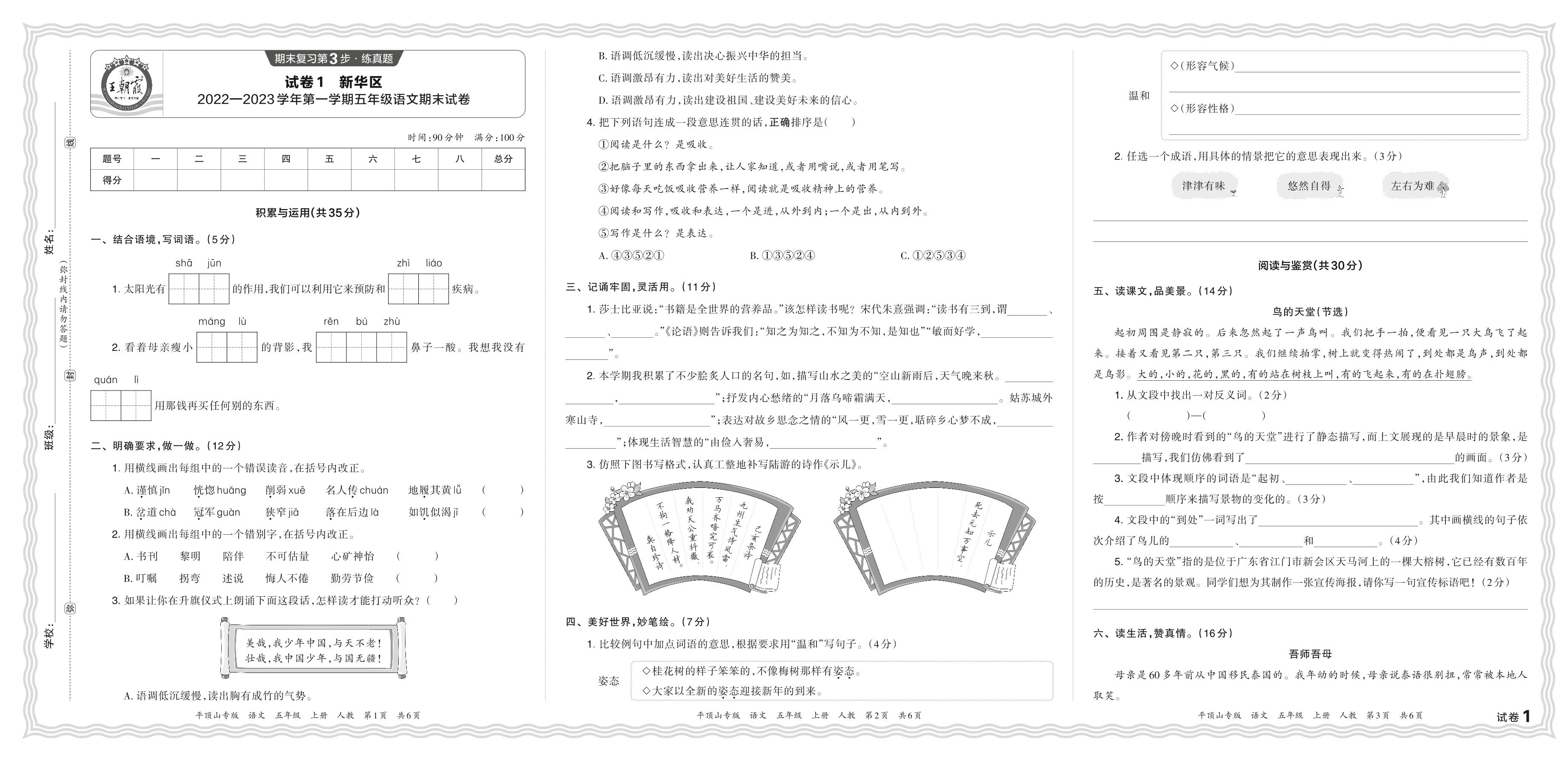 河南省平顶山市新华区2022—2023学年第一学期五年级语文期末试卷(人教版)【1】