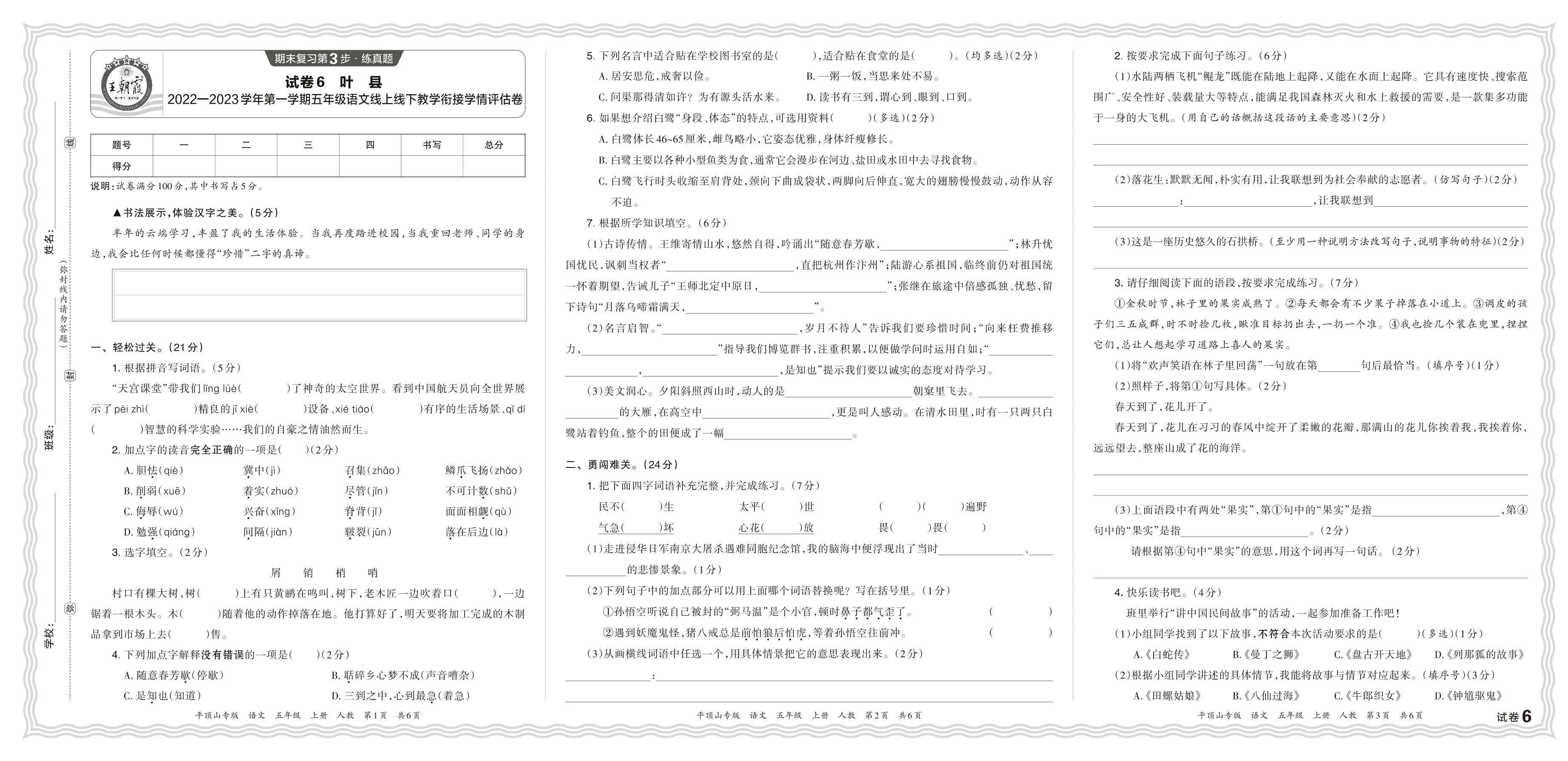 河南省平顶山市叶县2022—2023学年第一学期五年级语文线上线下教学衔接学情评估卷(人教版)【6】