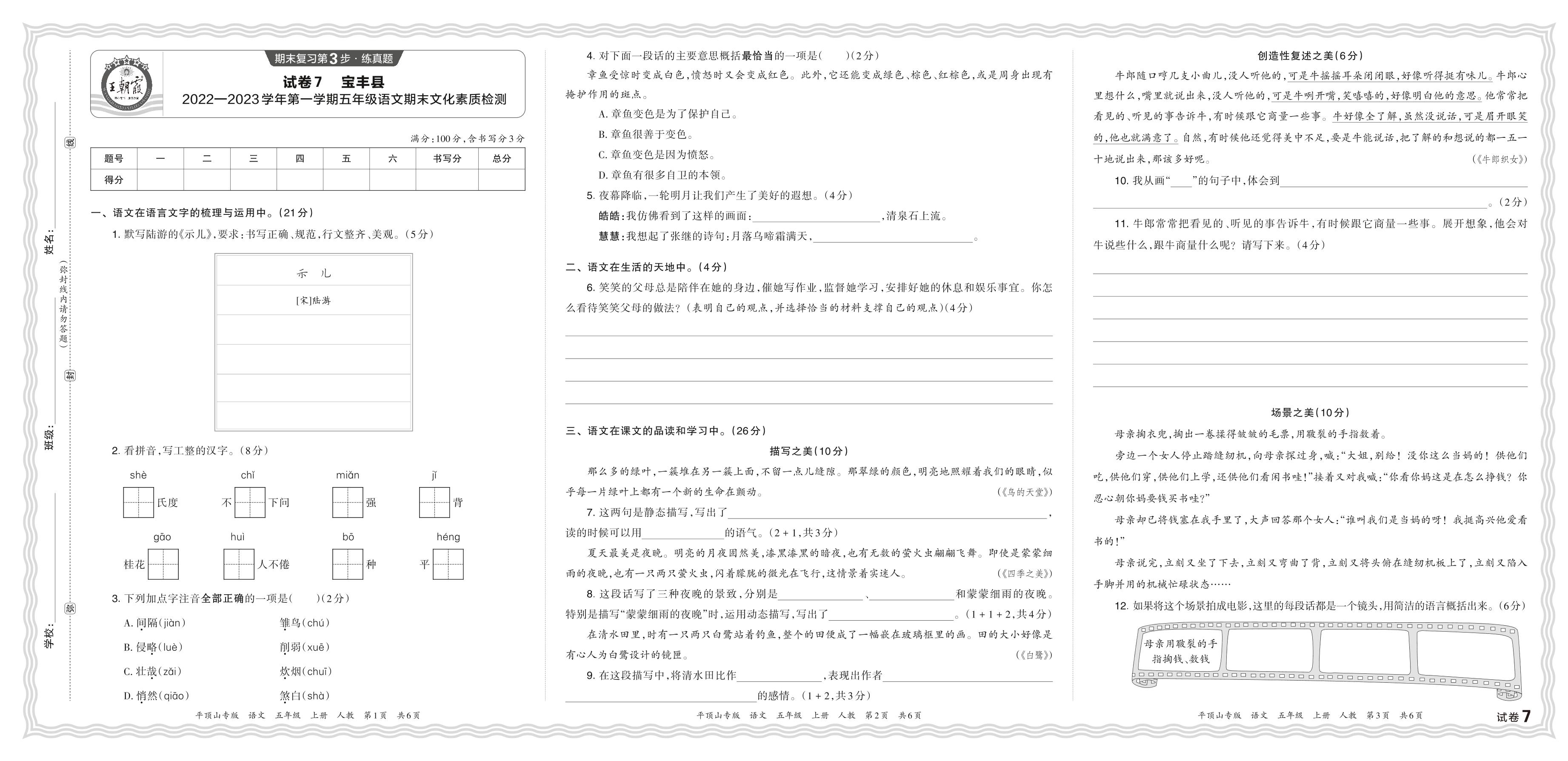 河南省平顶山市宝丰县2022—2023学年第一学期五年级语文期末文化素质检测(人教版)【7】