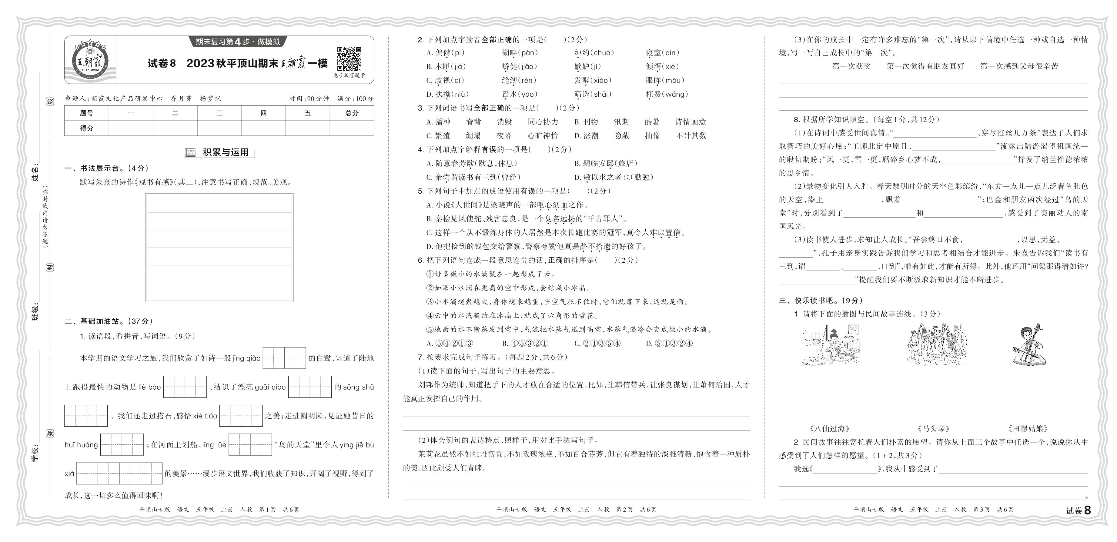 2023秋上册五年级语文人教版 河南平顶山期末王朝霞一模【8】