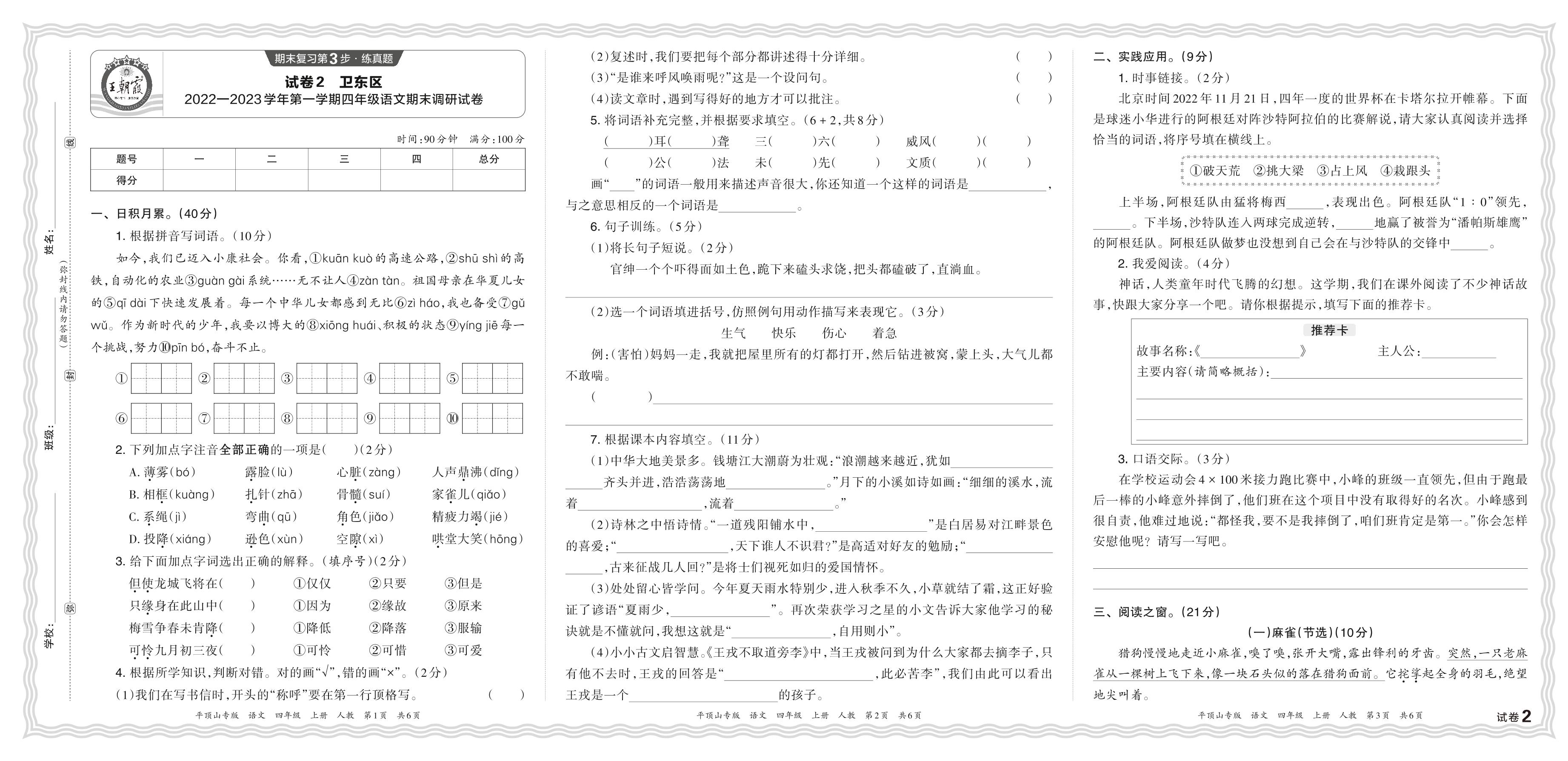 河南省平顶山市卫东区2022—2023学年第一学期四年级语文期末调研试卷(人教版)【2】