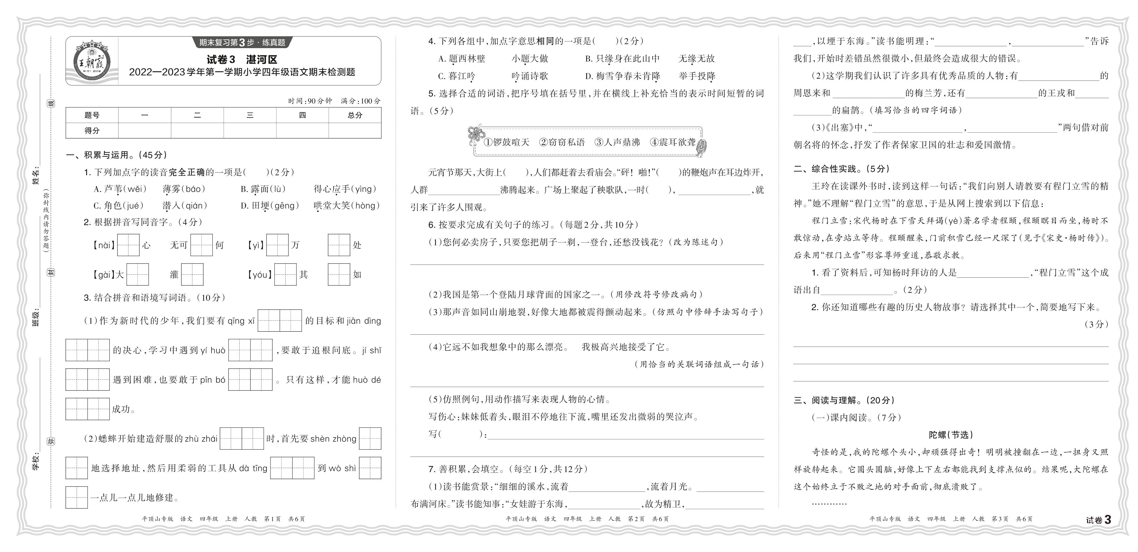 河南省平顶山市湛河区2022—2023学年第一学期小学四年级语文期末检测题(人教版)【3】