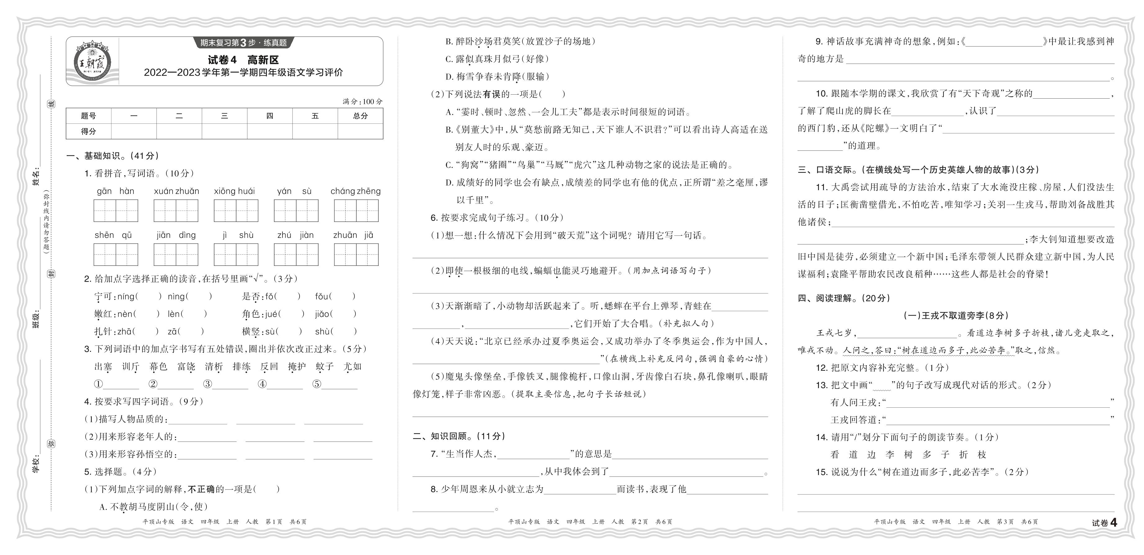 河南省平顶山市高新区2022—2023学年第一学期四年级语文学习评价(人教版)【4】