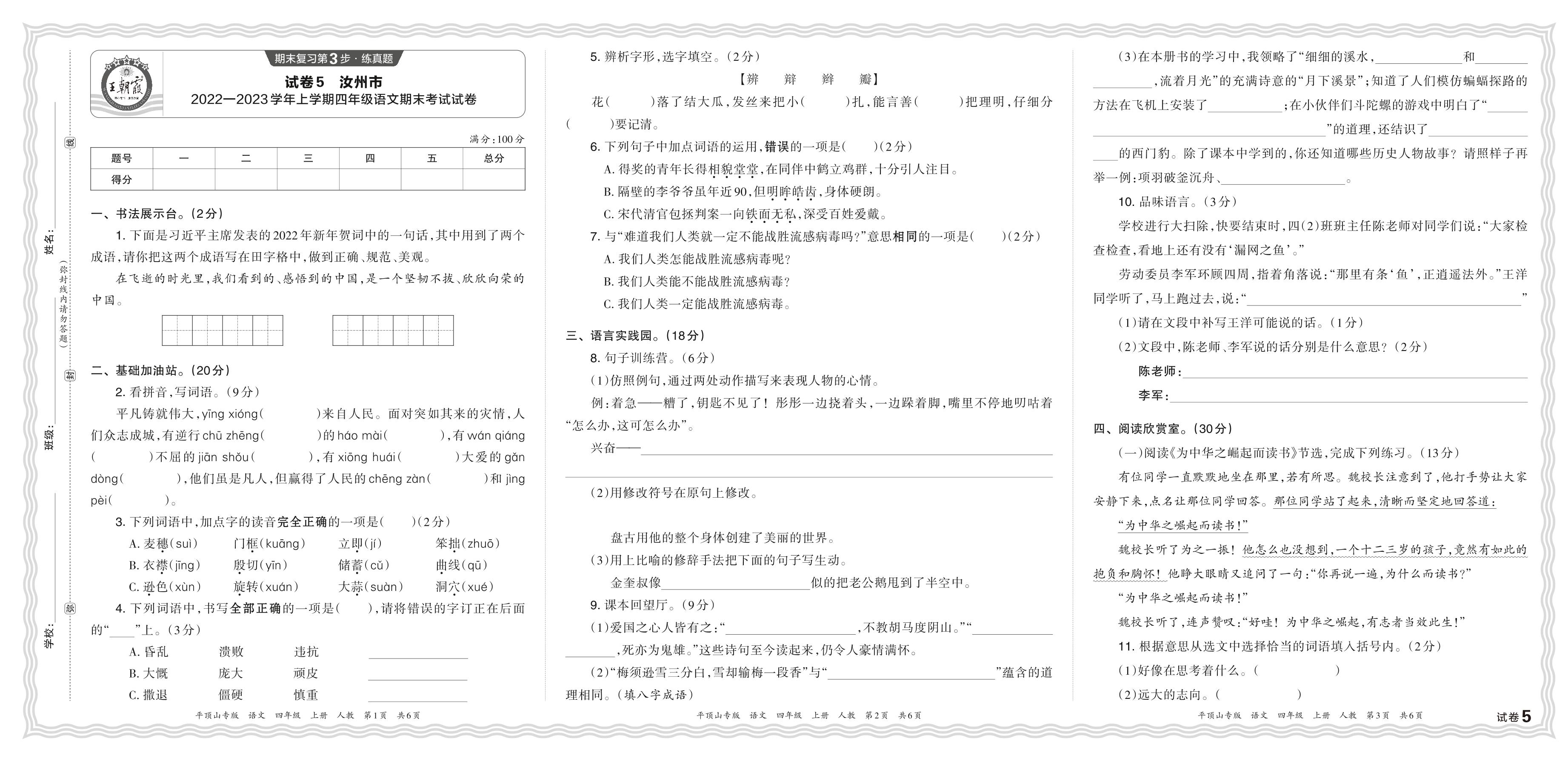 河南省平顶山市汝州市2022—2023学年上学期四年级语文期末考试试卷(人教版)【5】