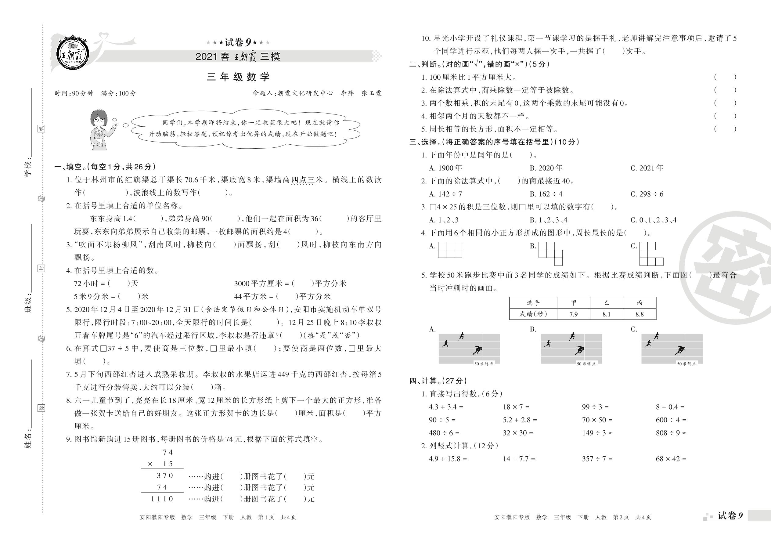 王朝霞期末模拟卷三年级下册数学(人教版)_R21080484530【9】