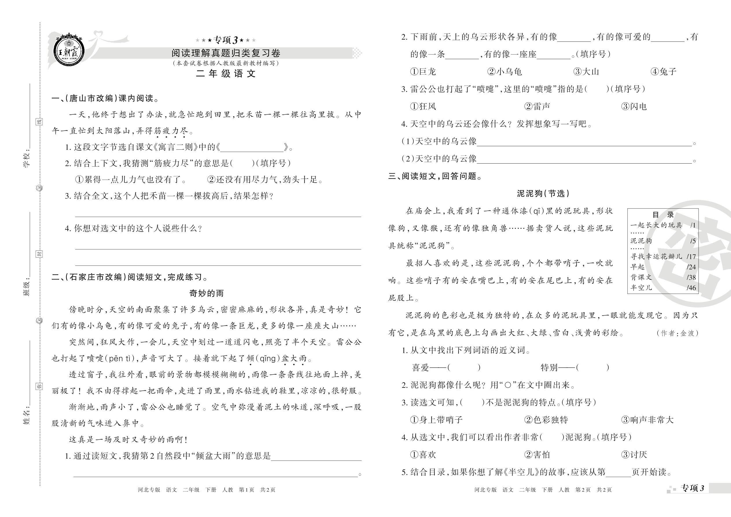 王朝霞期末专项卷——阅读理解、写话真题归类复习二年级下册语文(人教版)_R21080163857【0】