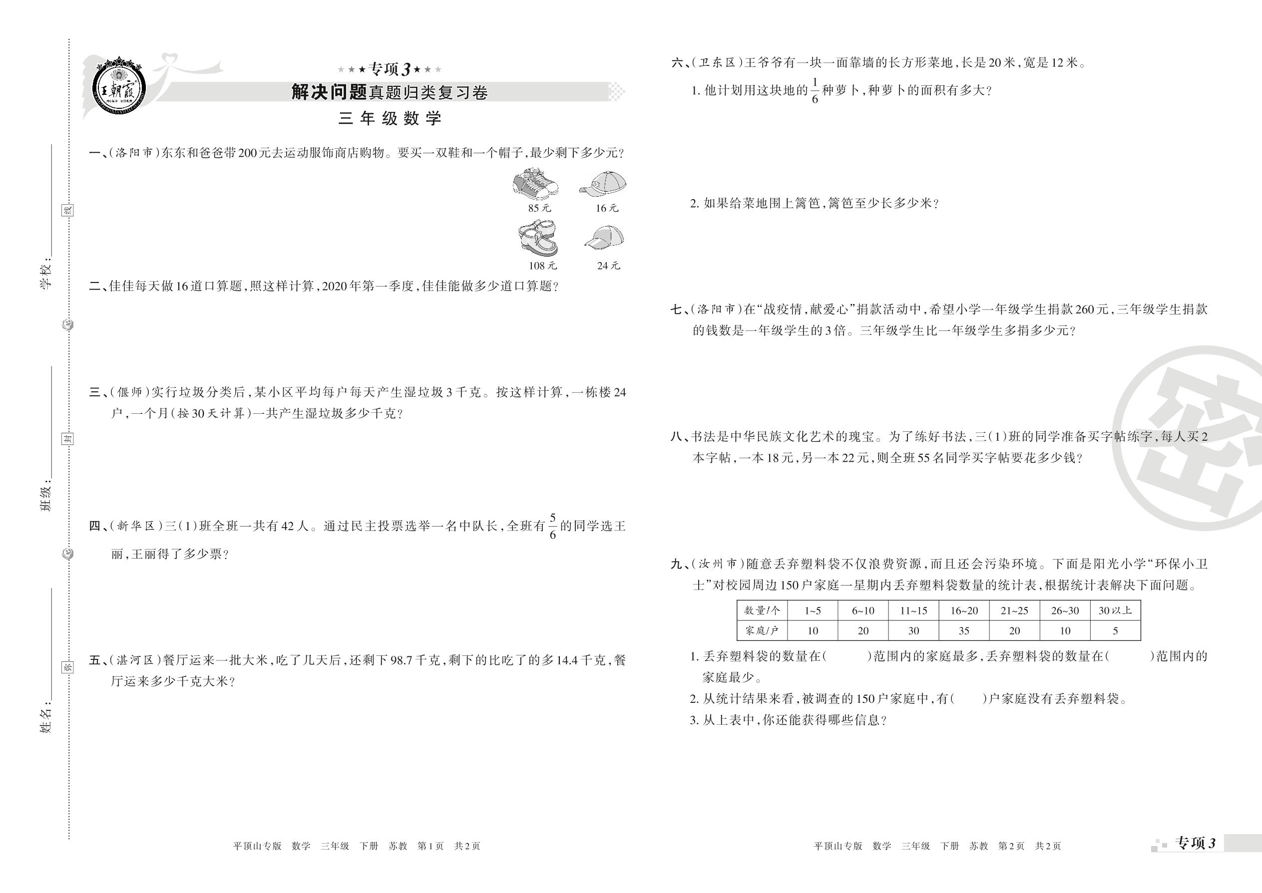 王朝霞期末专项卷——解决问真题归类复习题、新颖题速递:生活与数学三年级下册数学(苏教版)【0】