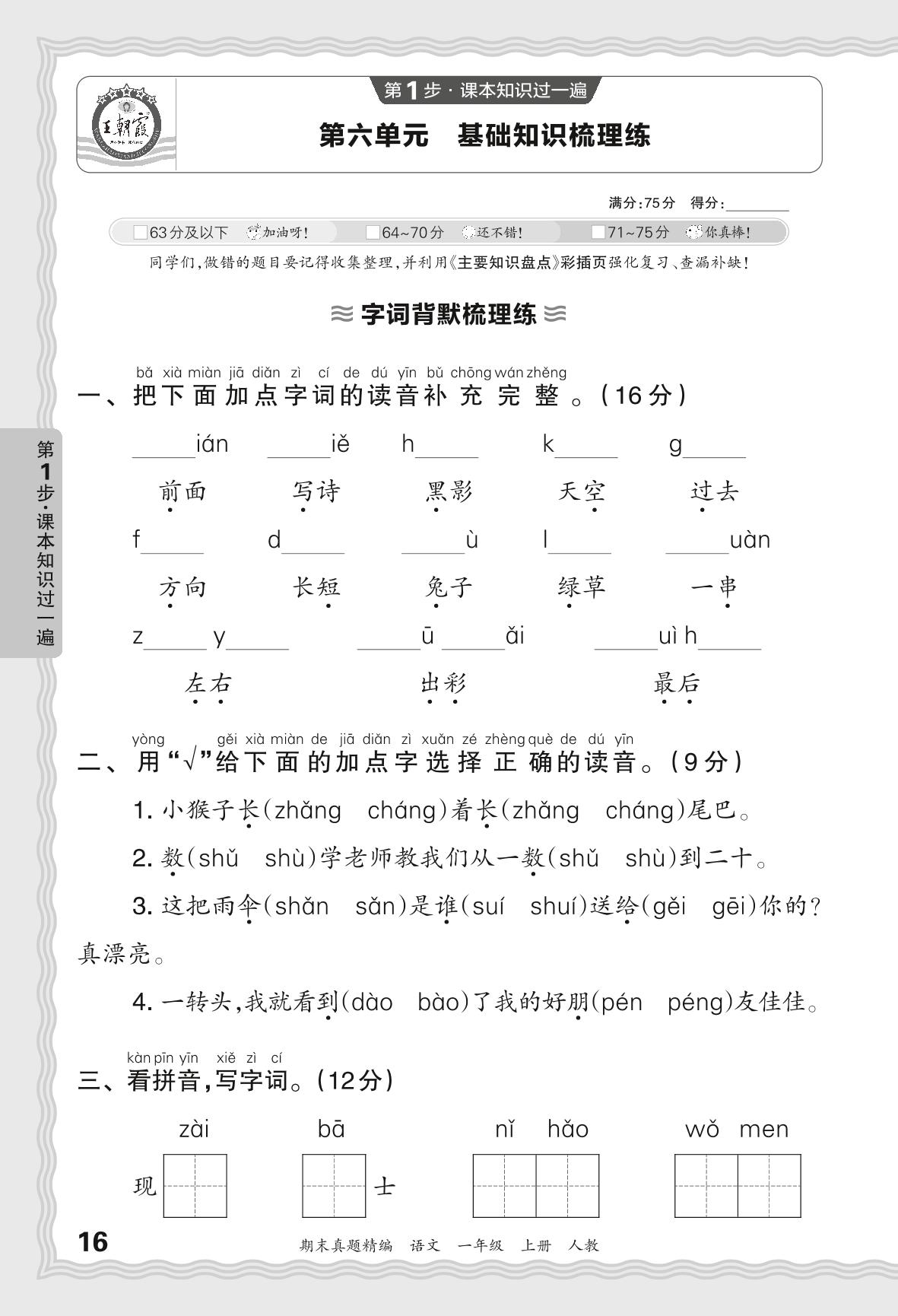2023秋上册一年级语文人教版 期末过课本JB版·第六单元 基础知识梳理练