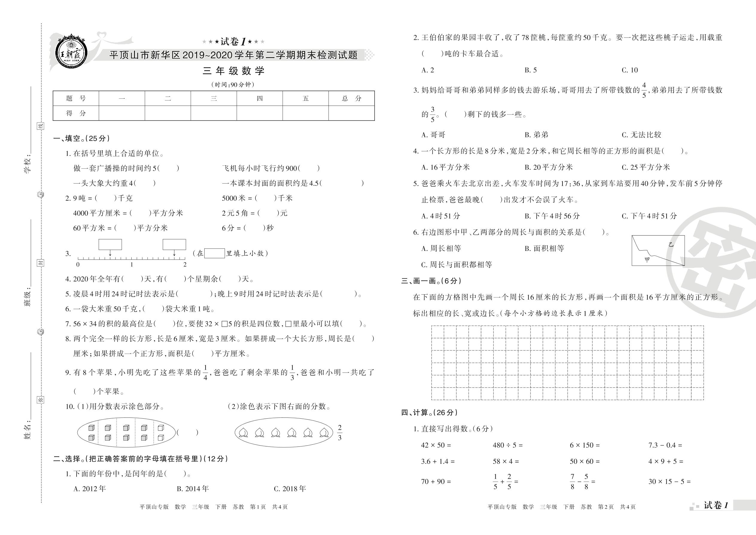 2019-2020学年第二学期平顶山市新华区三年级数学试卷(苏教版)_R21080484611【1】