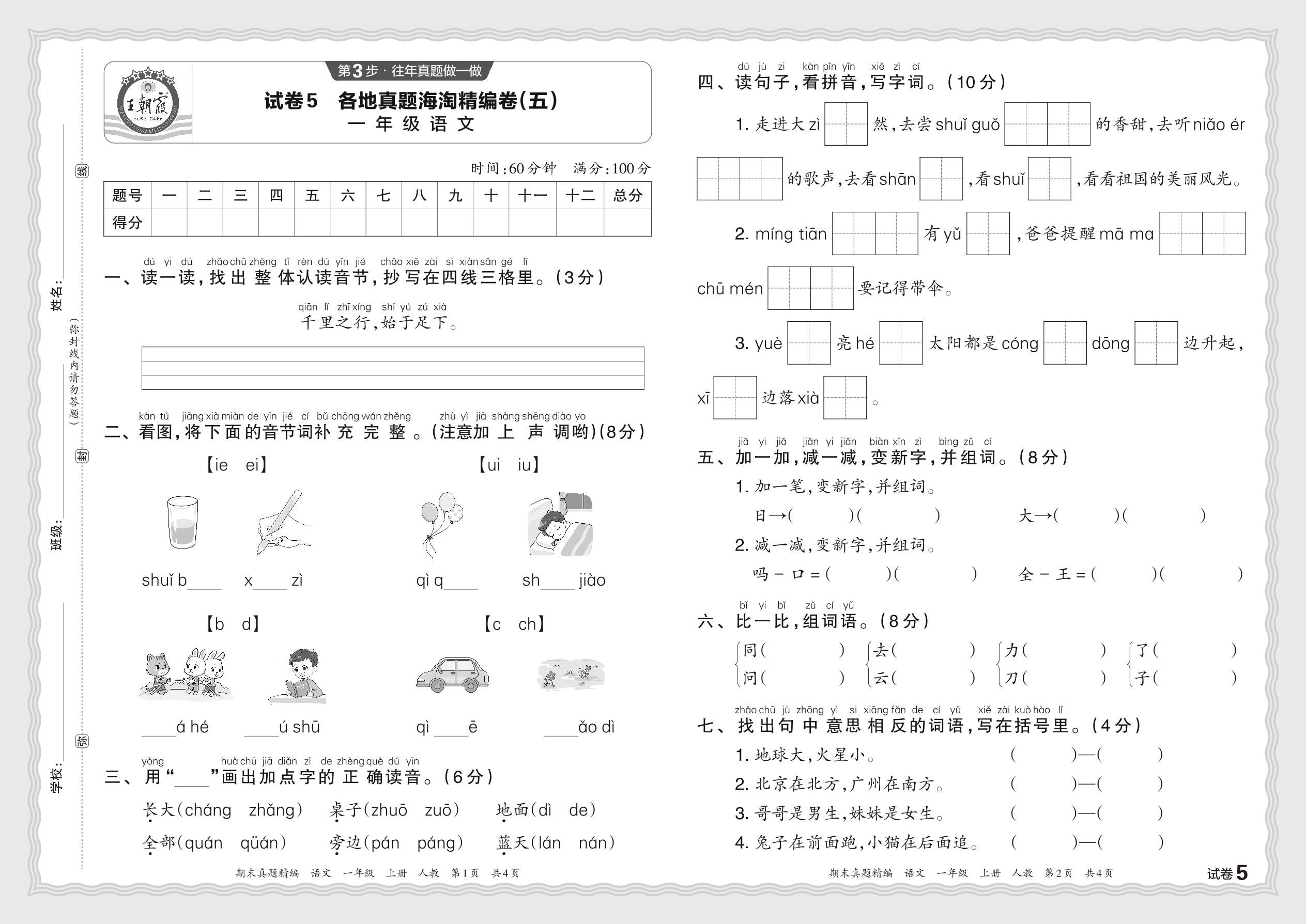 2023秋上册一年级语文人教版 各地真题海淘精编卷(五)JB