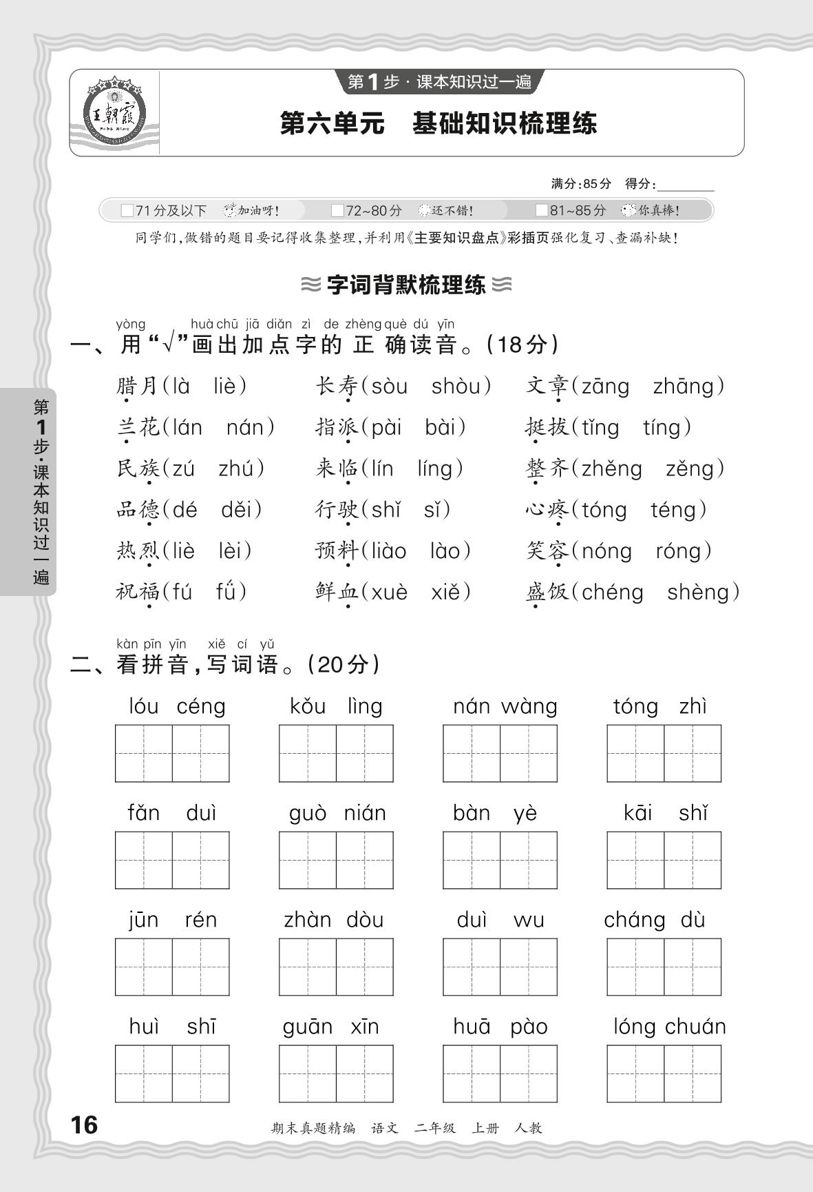 2023秋上册二年级语文人教版 期末过课本JB版·第六单元 基础知识梳理练