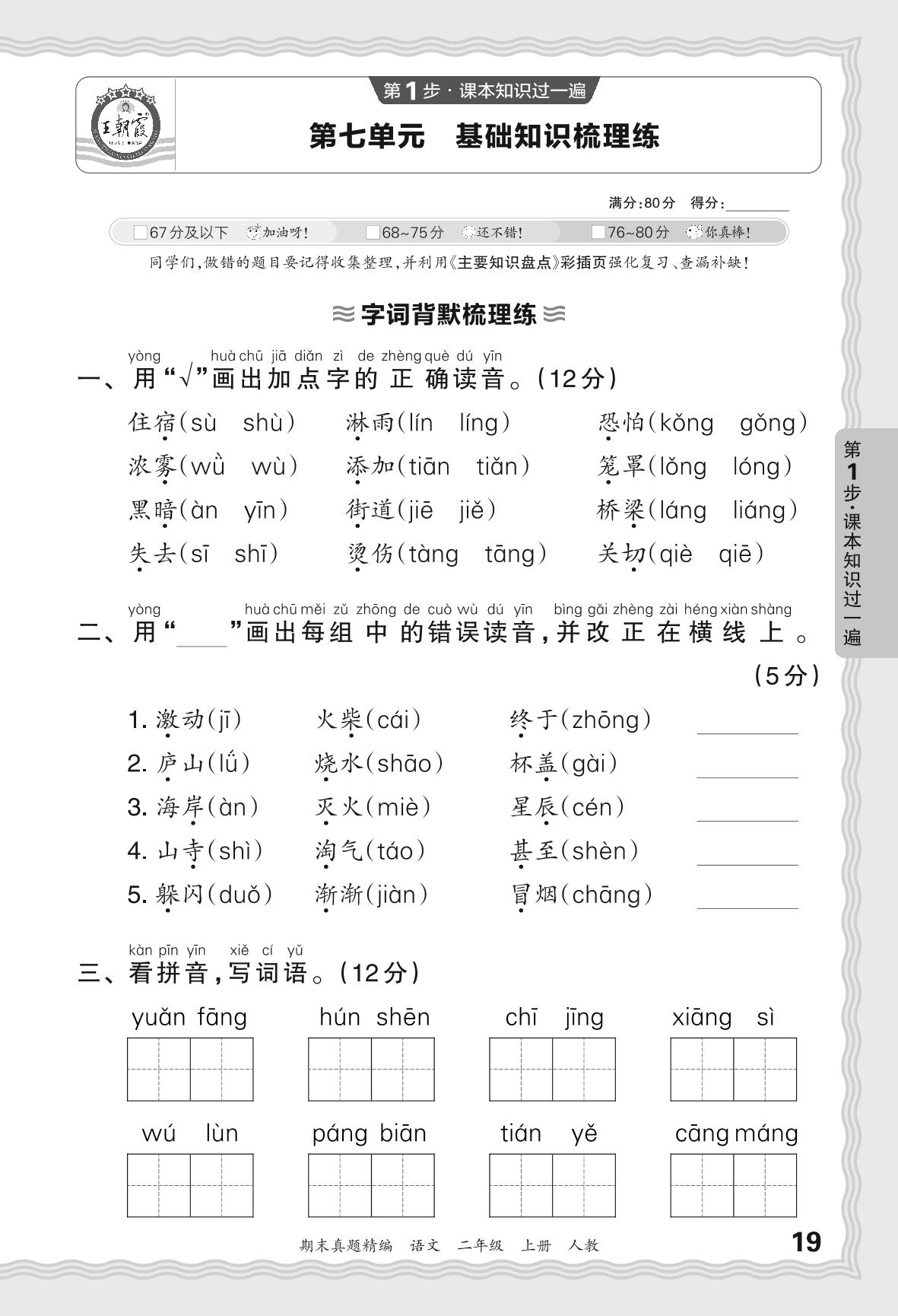 2023秋上册二年级语文人教版 期末过课本JB版·第七单元 基础知识梳理练