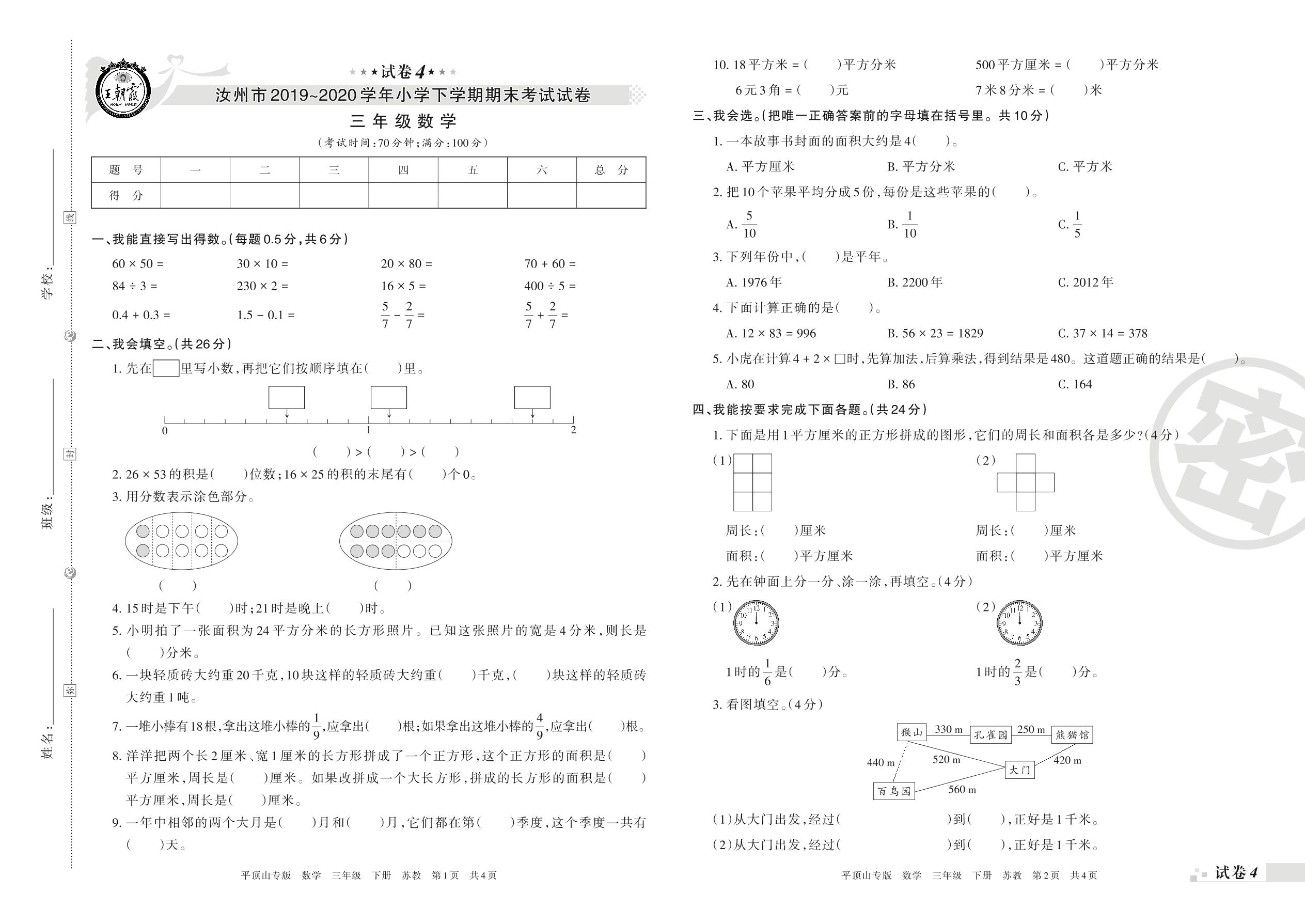 三年级数学苏教版下册期末卷