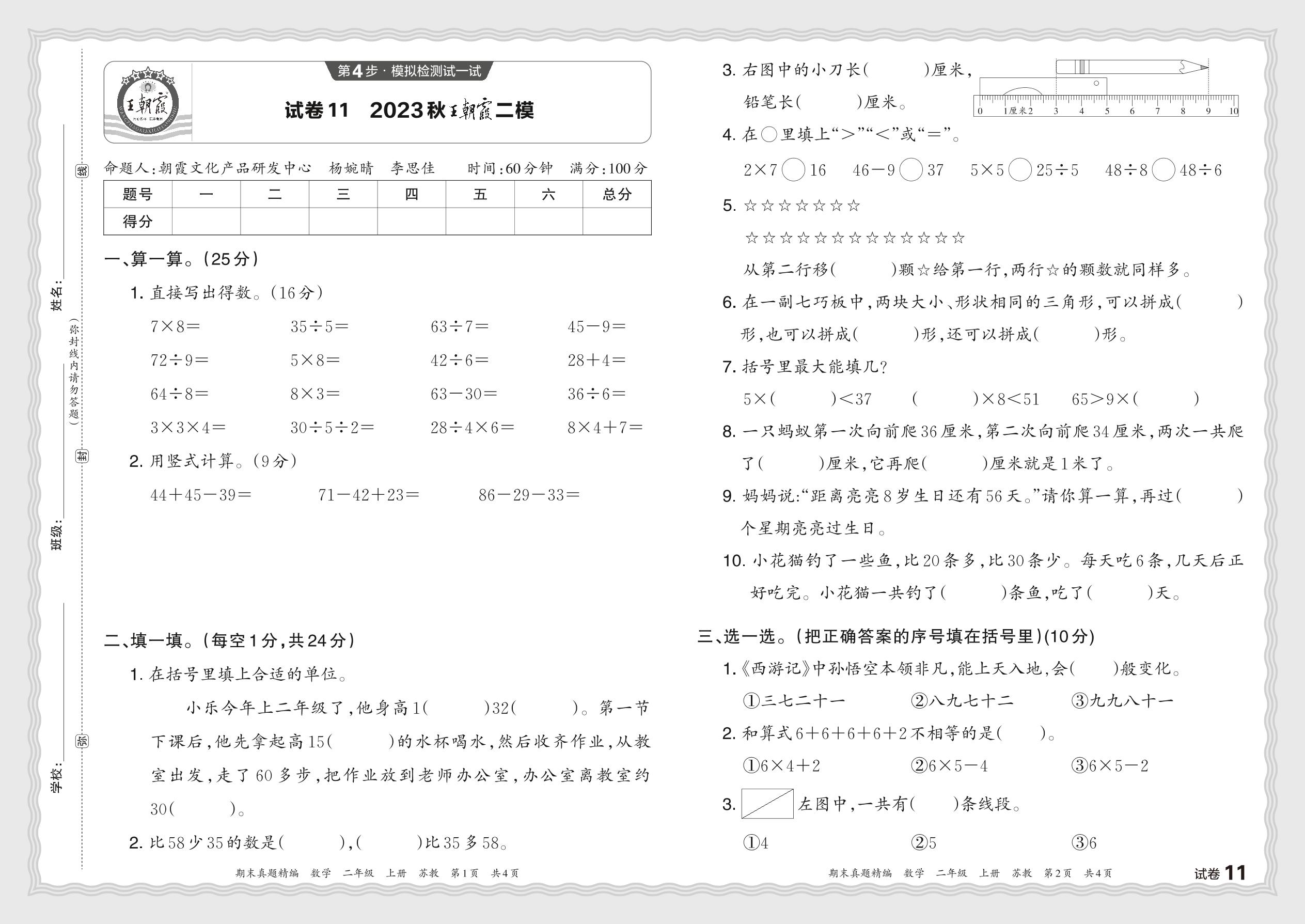 2023秋上册二年级数学苏教版 王朝霞二模JB