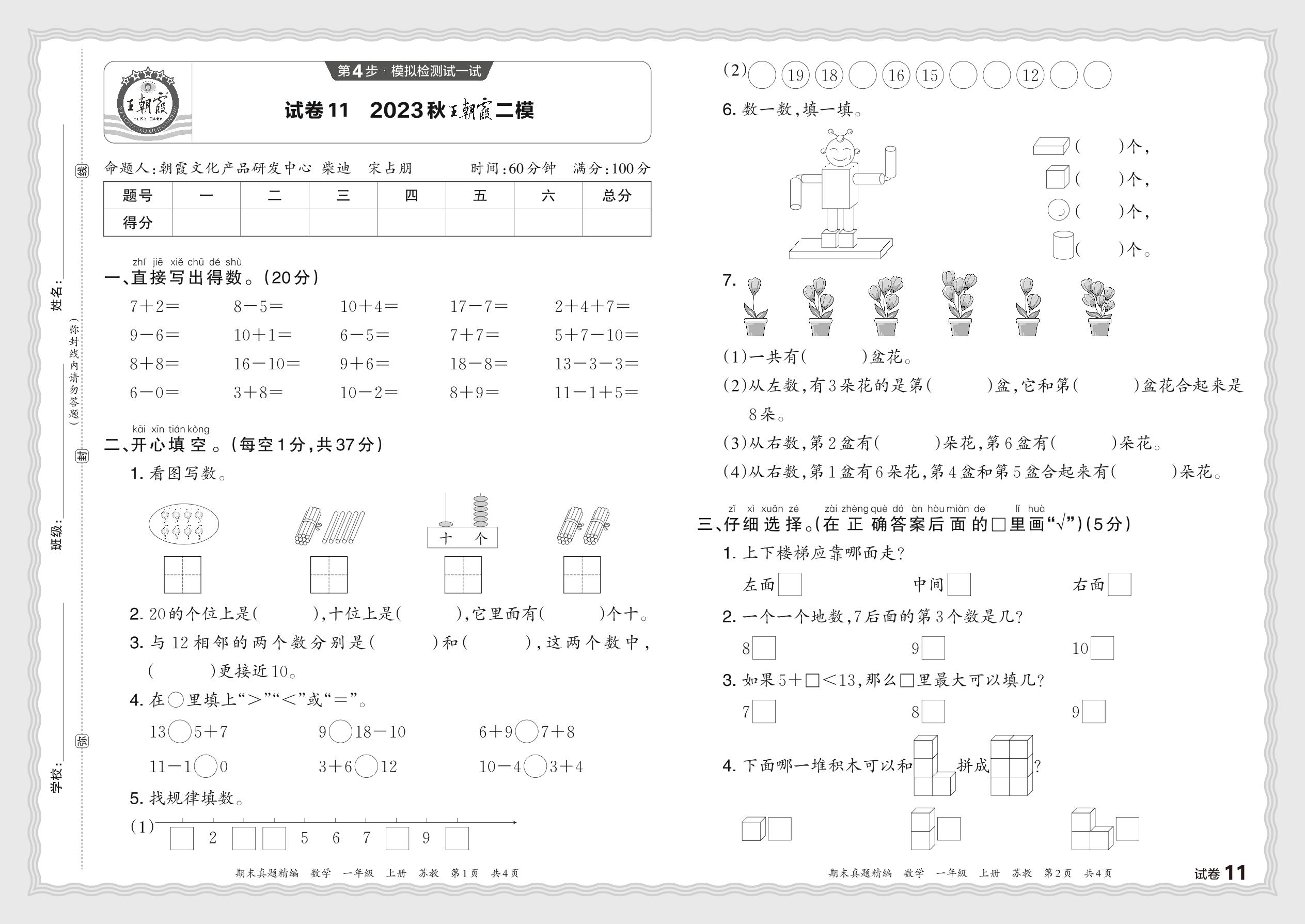 2023秋上册一年级数学苏教版 王朝霞二模JB