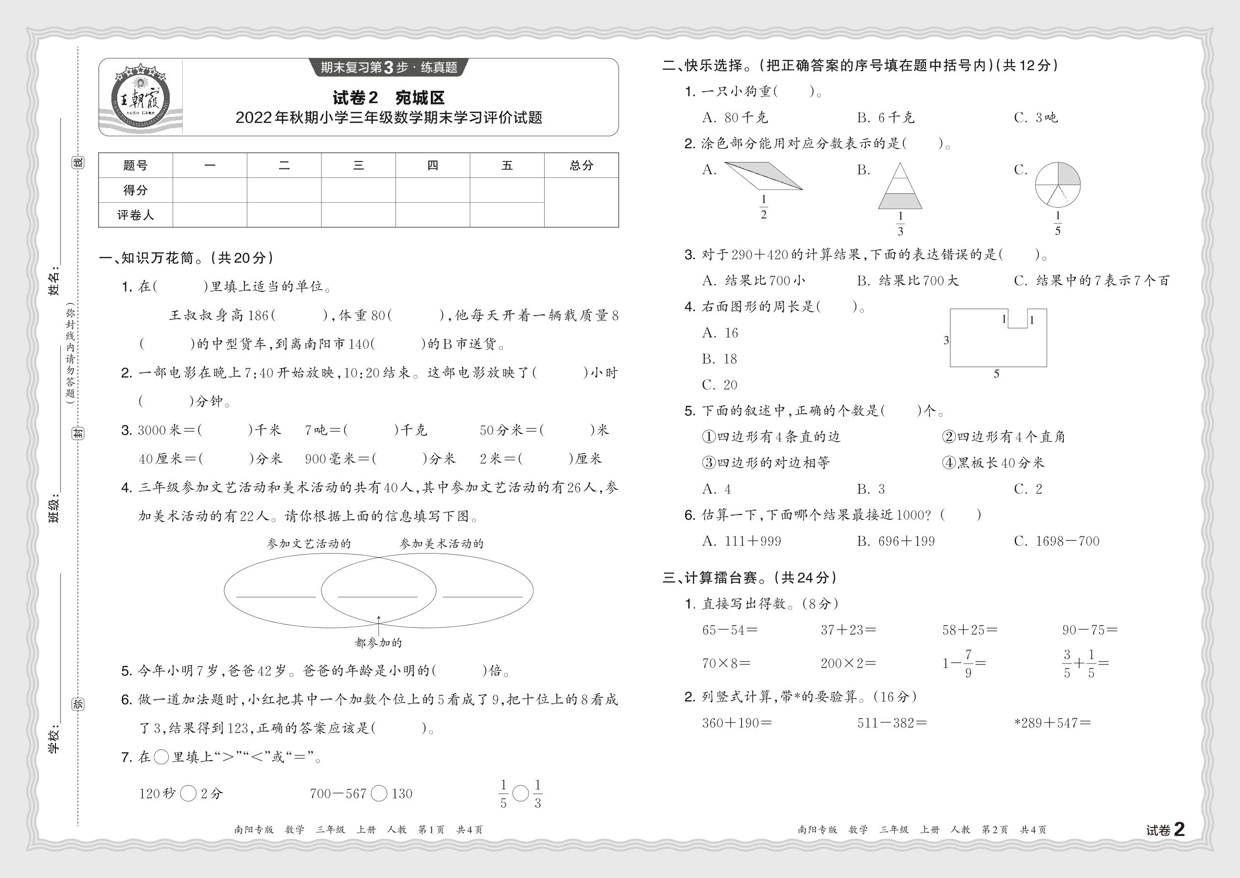 河南省南阳市宛城区2022年秋期小学三年级数学期末学习评价试题(人教版)【2】