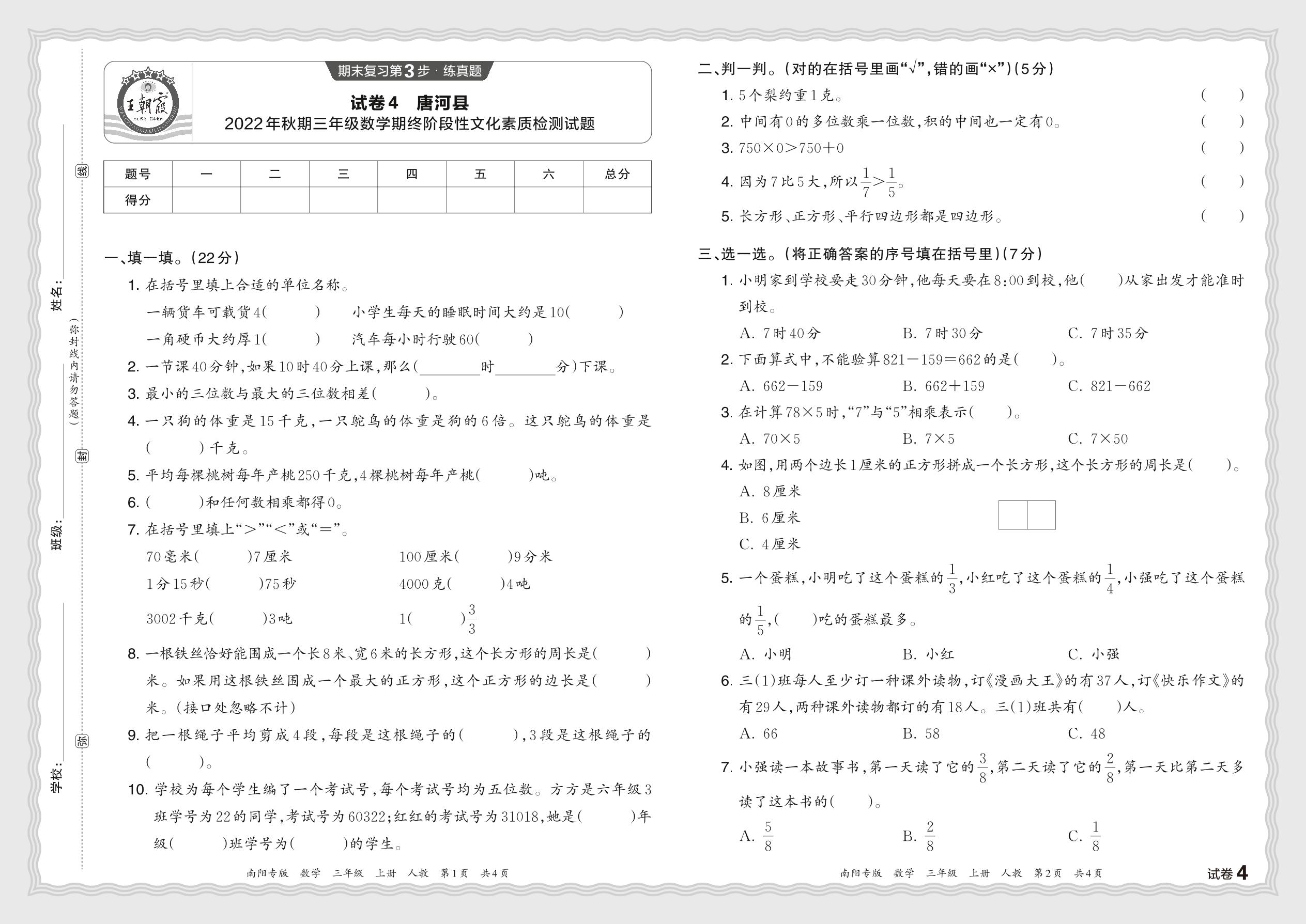 河南省南阳市唐河县2022年秋期三年级数学期终阶段性素质检测试题(人教版)【4】