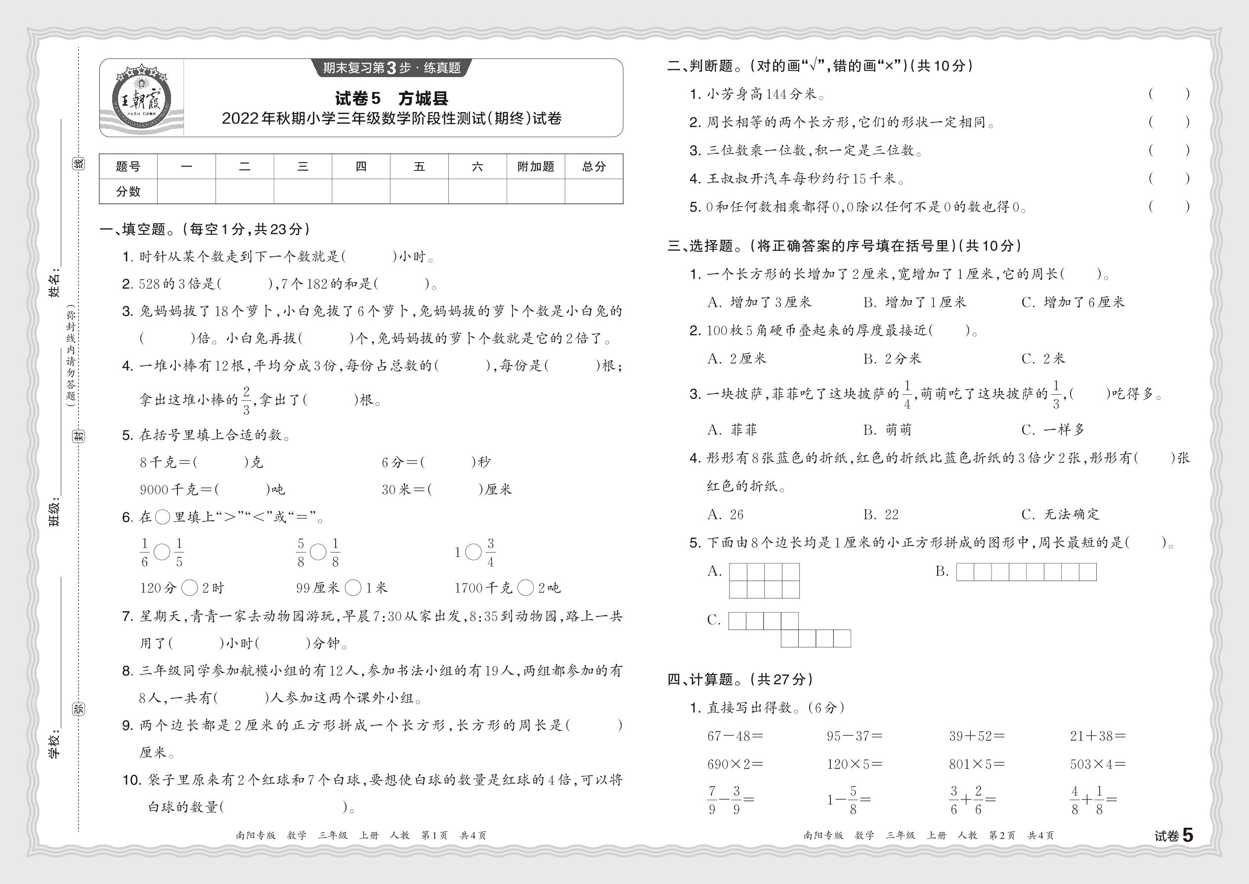 河南省南阳市方城县2022年秋期小学三年级数学学科文化素质调研工作期终作业题(人教版)【5】
