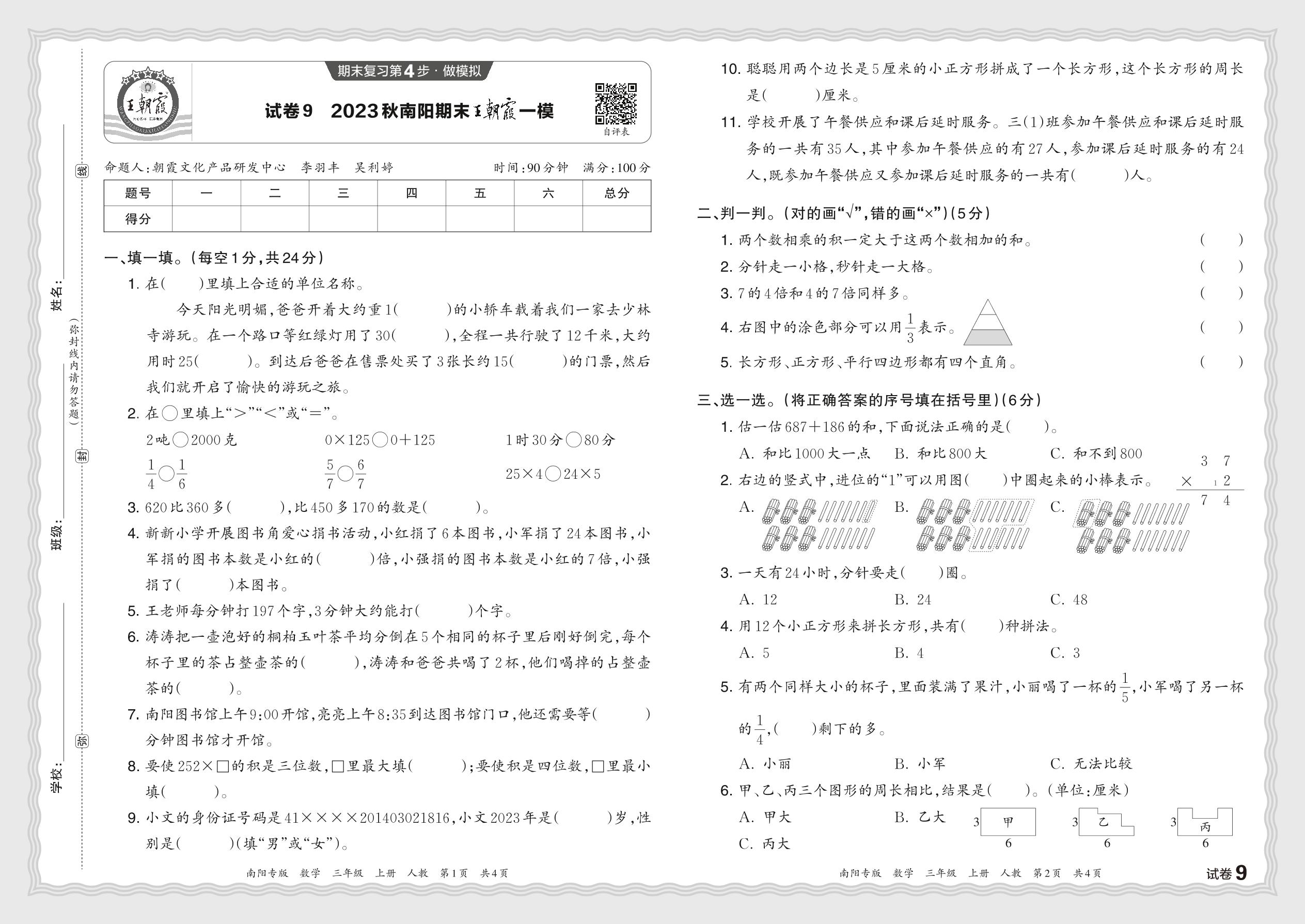 2023秋上册三年级数学人教版 河南南阳期末王朝霞一模【9】