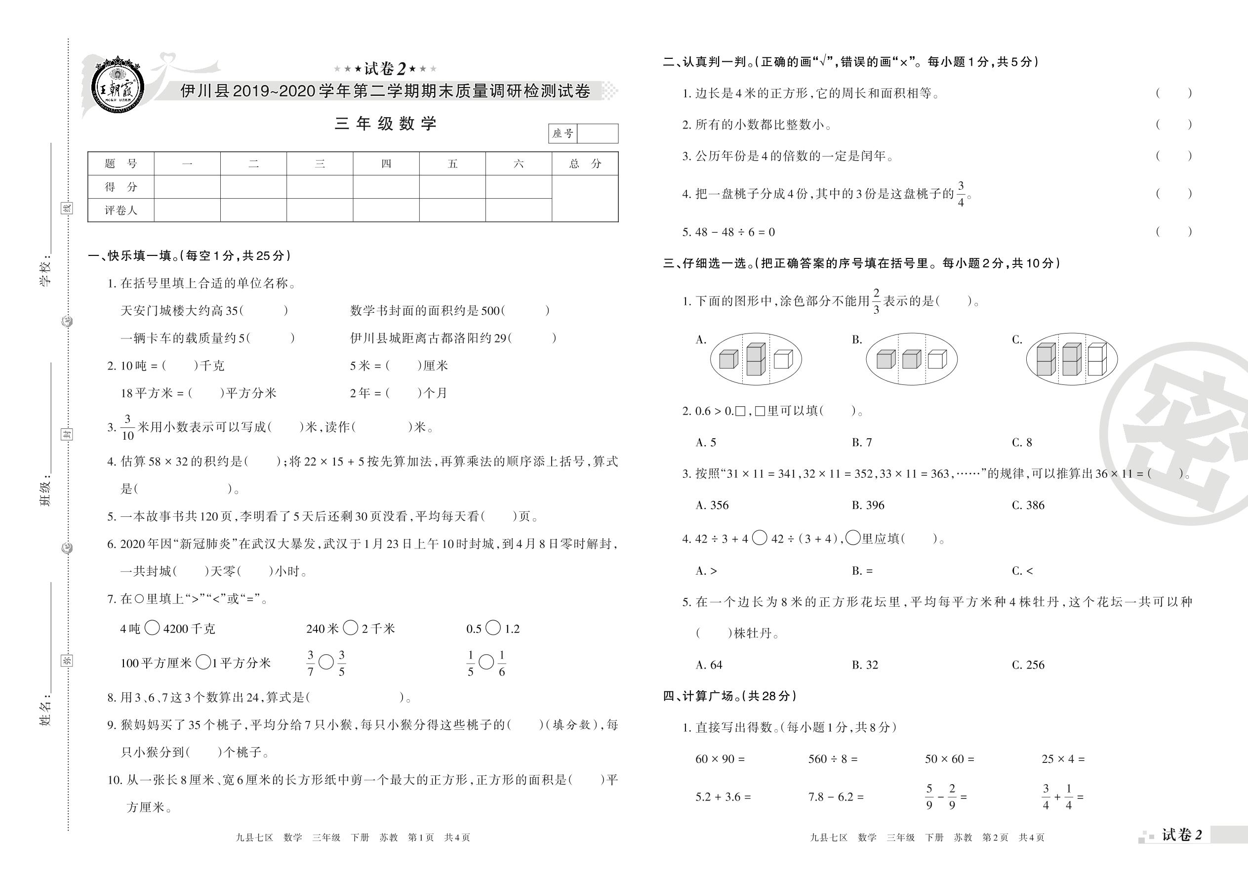 2019-2020学年第二学期洛阳市伊川县三年级数学试卷(苏教版)【2】