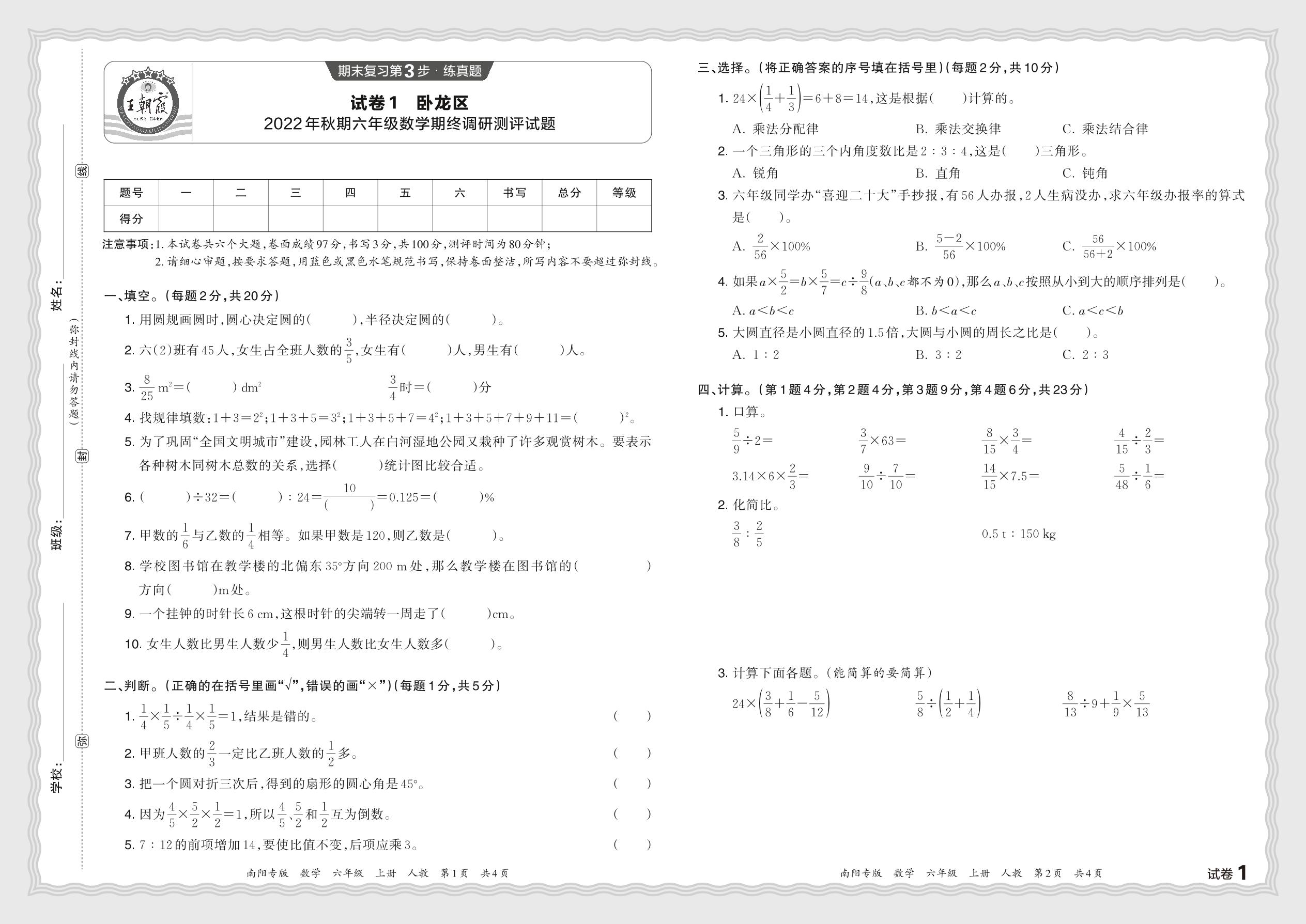 河南省南阳市卧龙区2022年秋期六年级数学期终调研测评试题(人教版)【1】