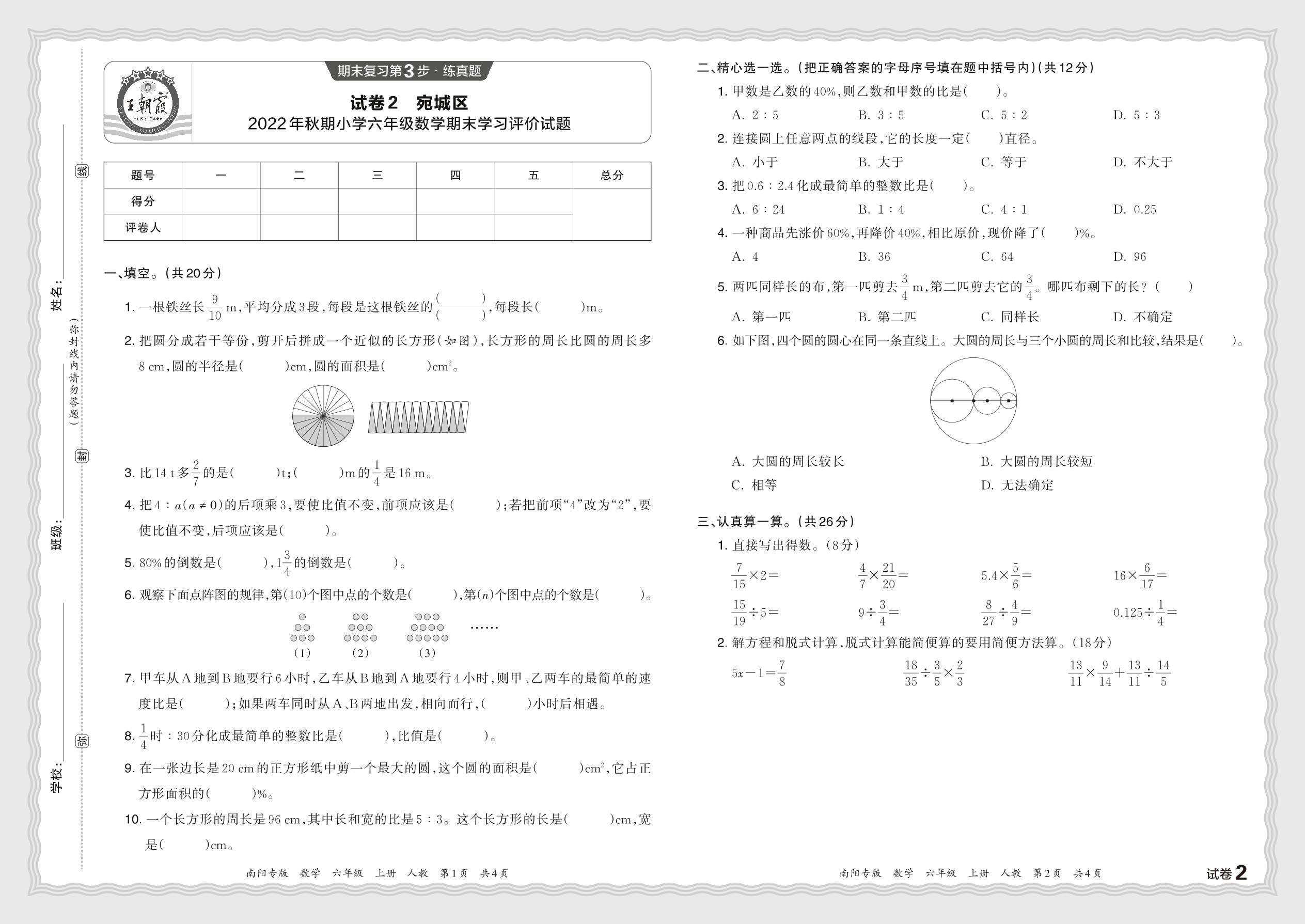 河南省南阳市宛城区2022年秋期小学六年级数学期末学习评价试题(人教版)【2】