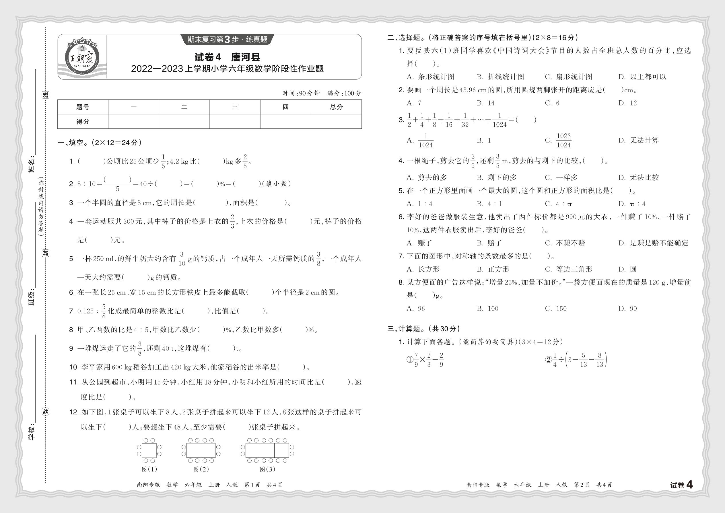 河南省南阳市唐河县2022-2023上学期小学六年级数学阶段性作业题(人教版)【4】