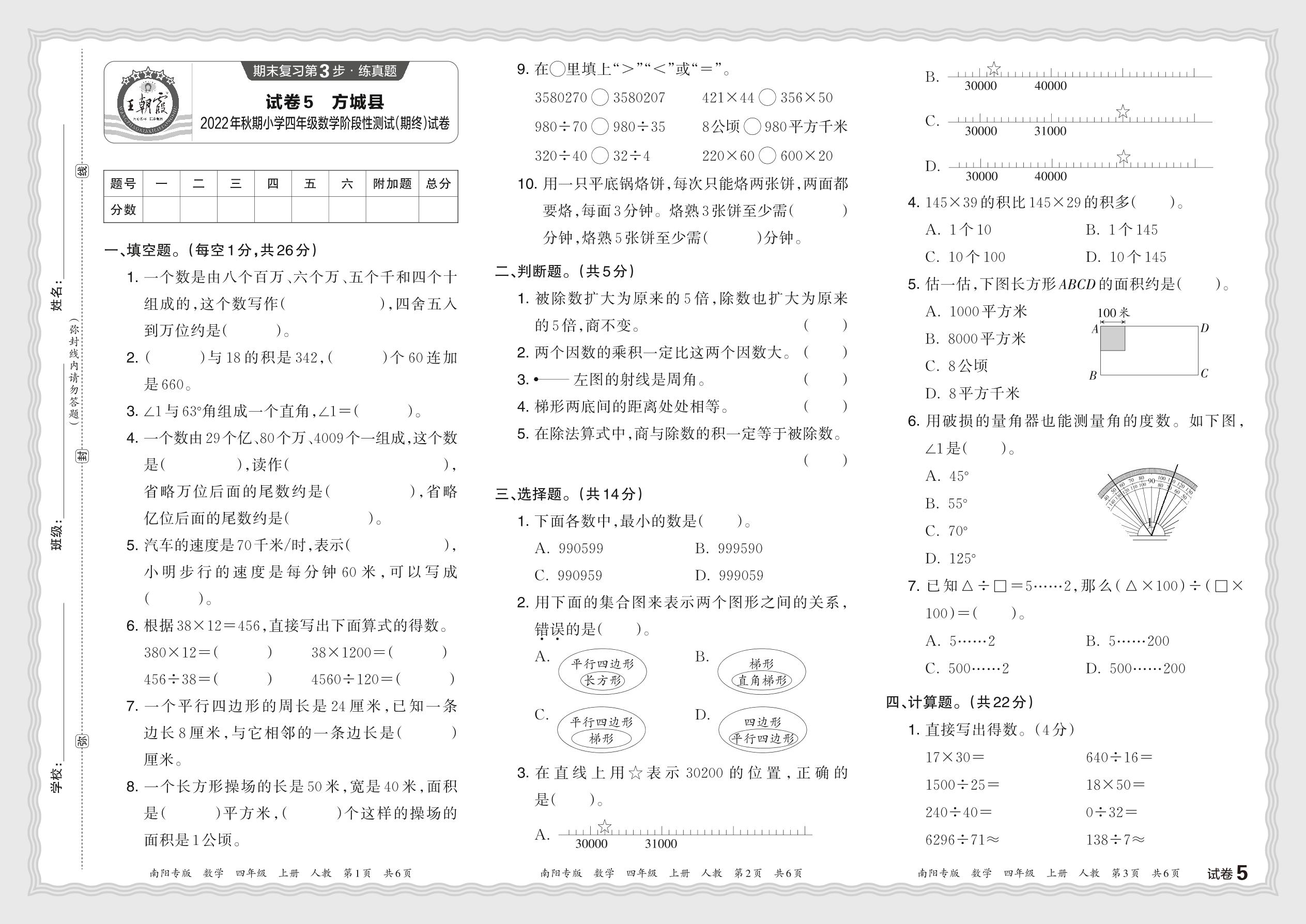 河南省南阳市方城县2022年秋期小学四年级数学阶段性测试(期终)试卷(人教版)【5】