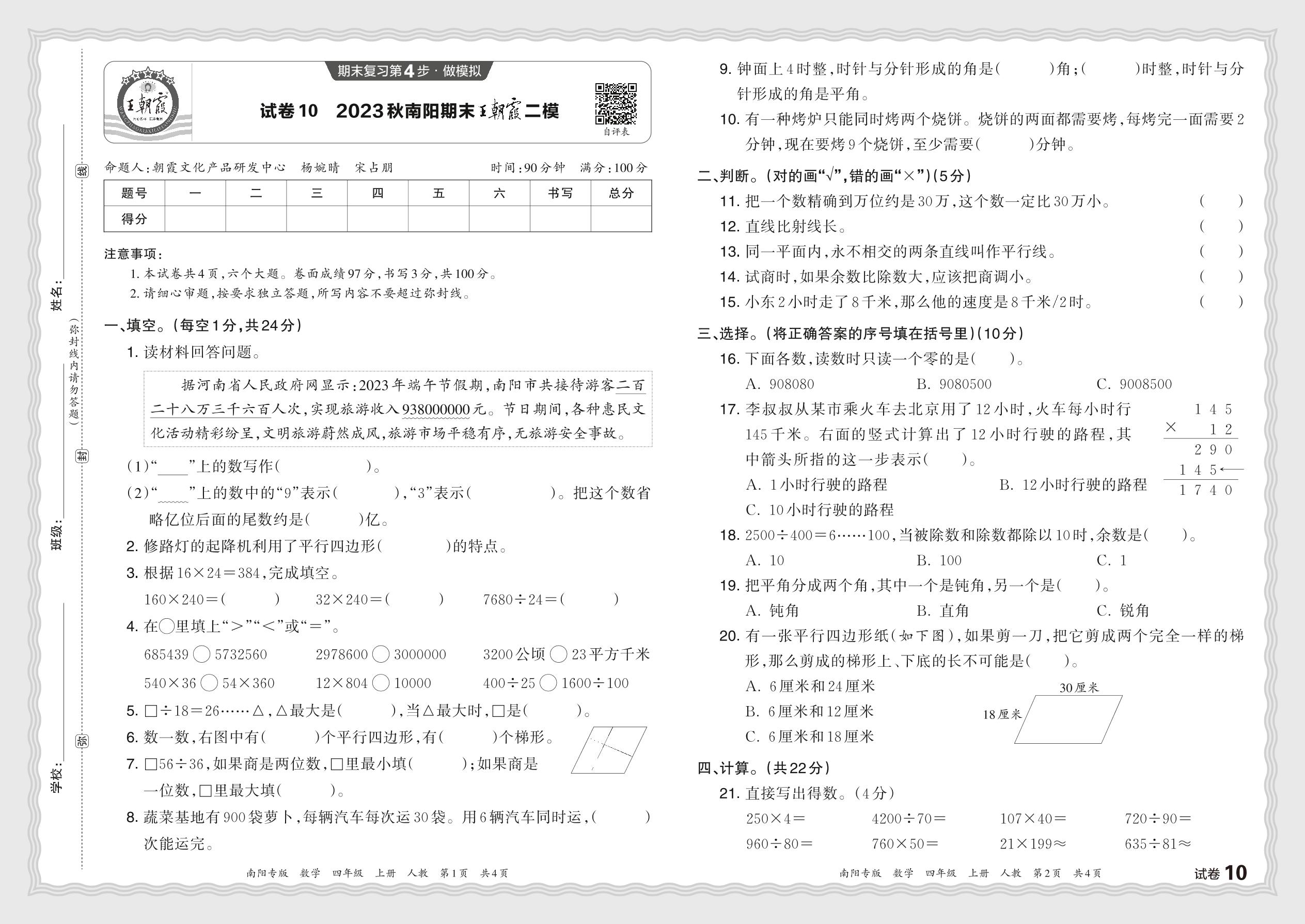 2023秋上册四年级数学人教版 河南南阳期末王朝霞二模【10】