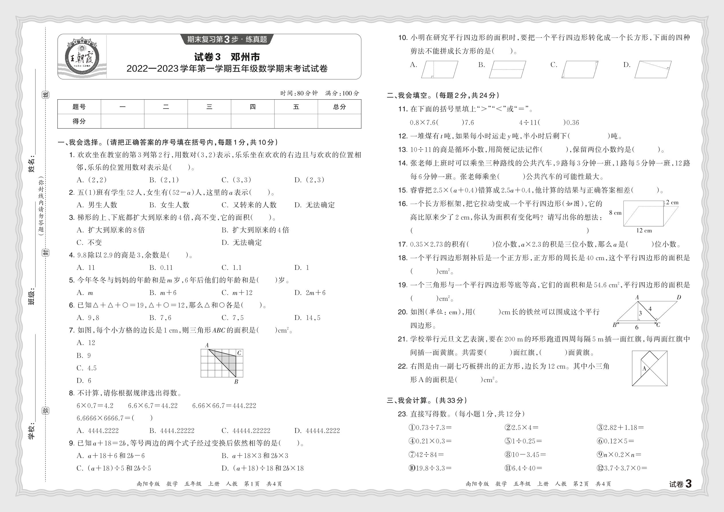 河南省南阳市邓州市2022-2023 学年第一学期五年级数学期末考试试卷(人教版)【3】