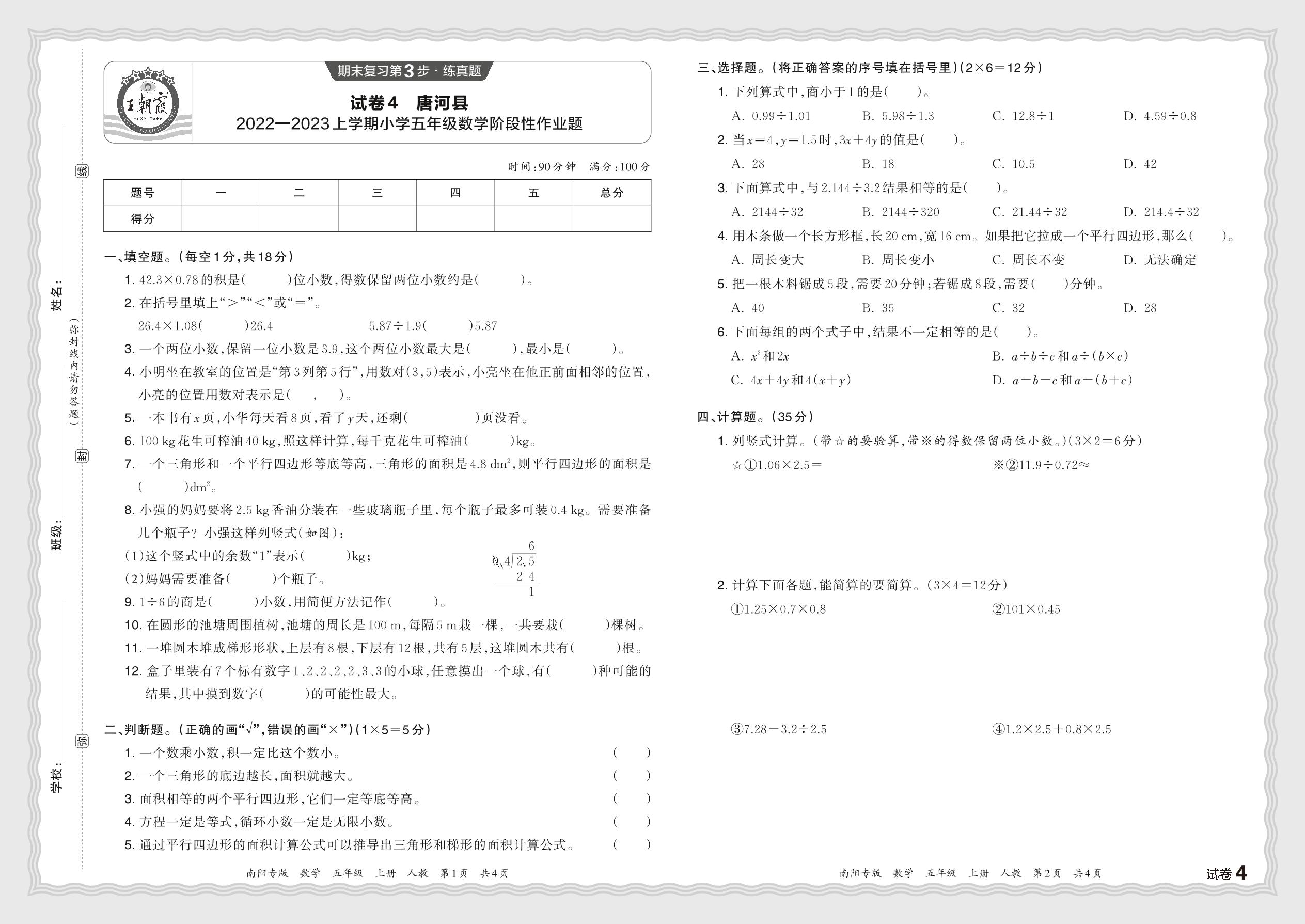 河南省南阳市唐河县2022-2023上学期小学五年级数学阶段性作业题(人教版)【4】