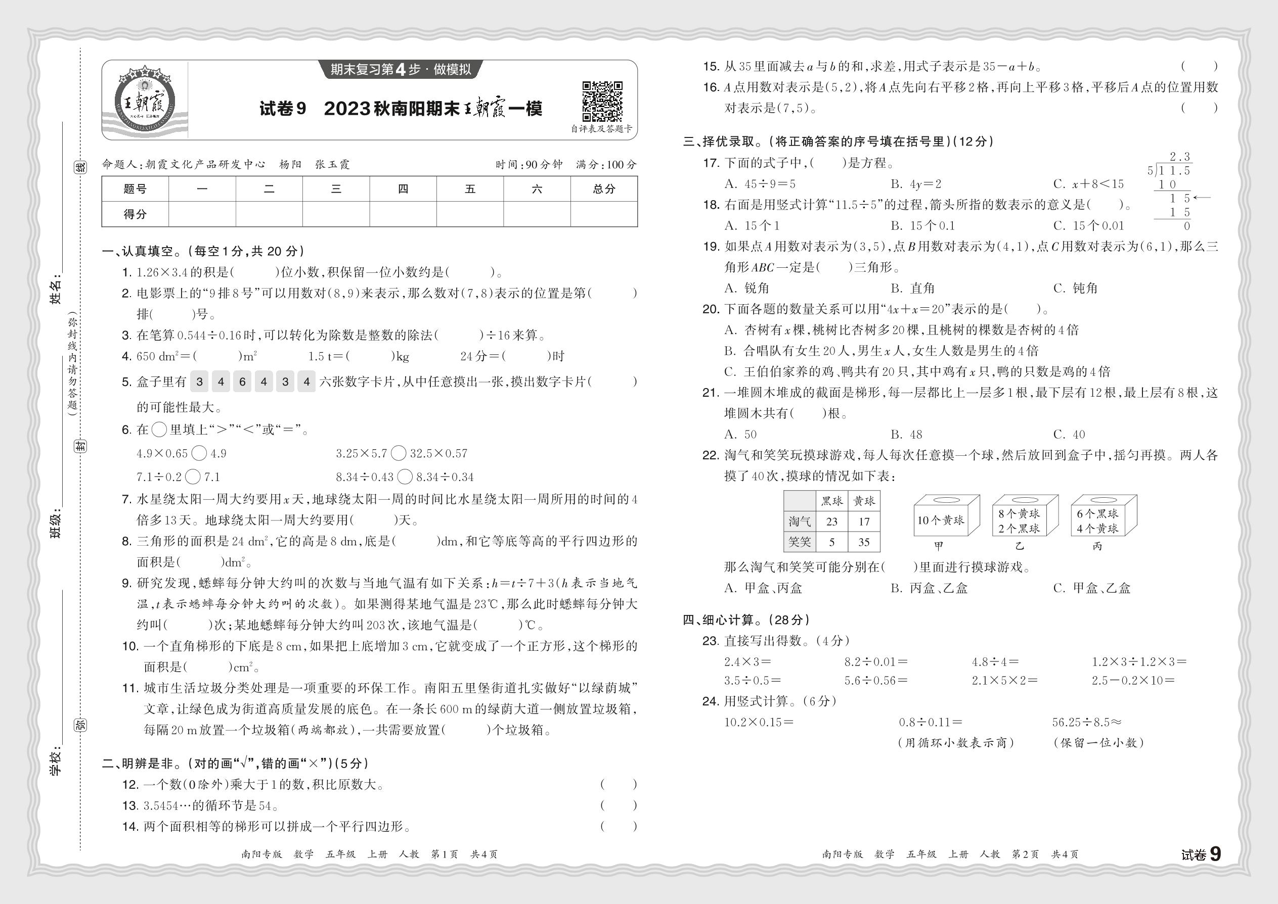 2023秋上册五年级数学人教版 河南南阳期末王朝霞一模【9】