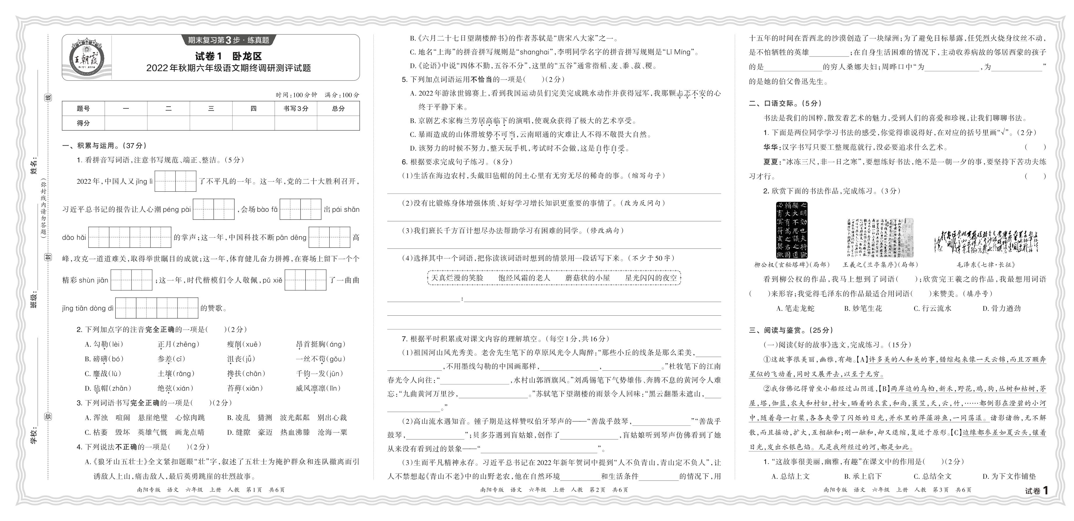 河南省南阳市卧龙区2022年秋期六年级语文期终调研测评试题(人教版)【1】