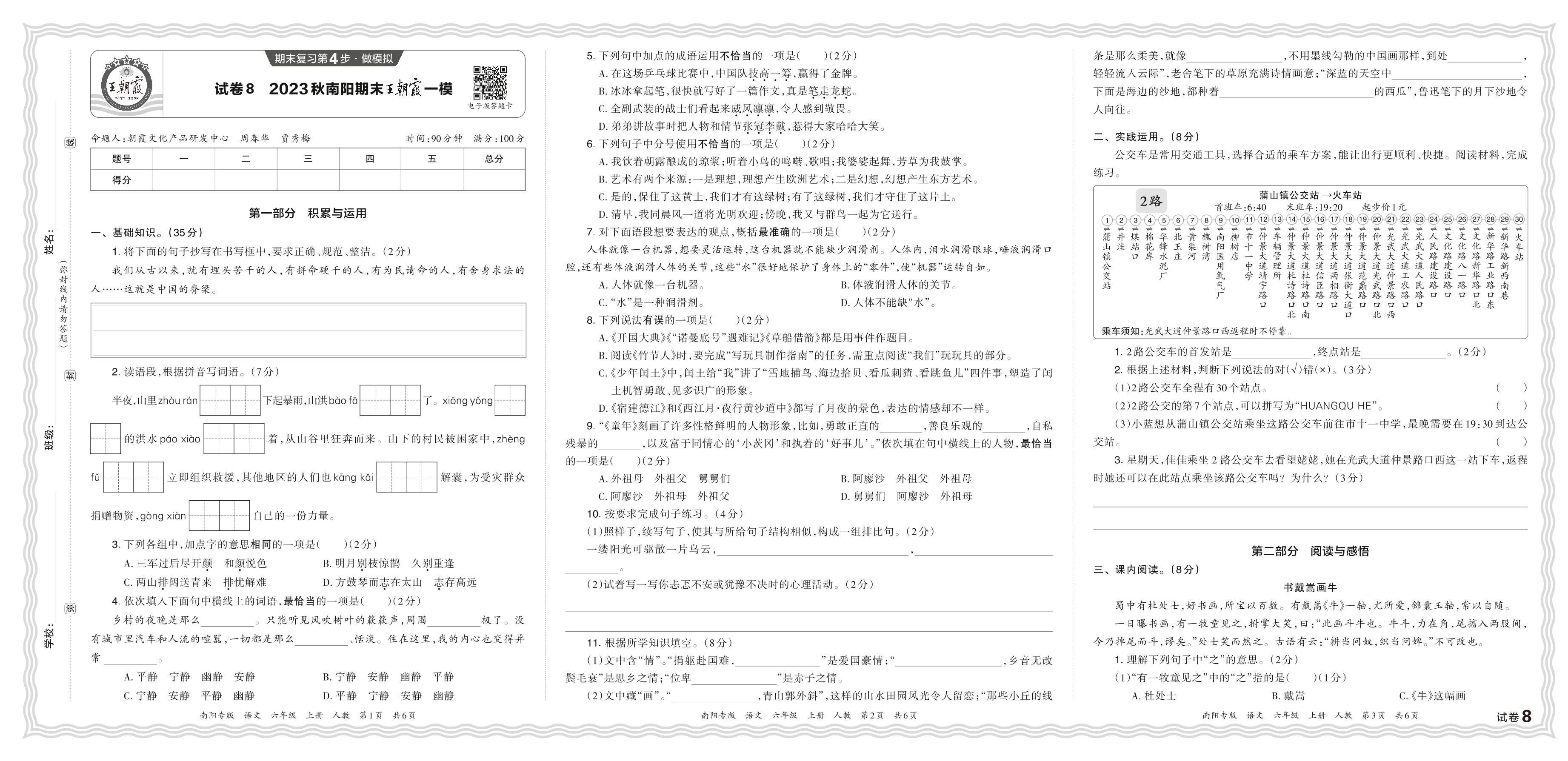 2023秋上册六年级语文人教版 河南南阳期末王朝霞一模【8】