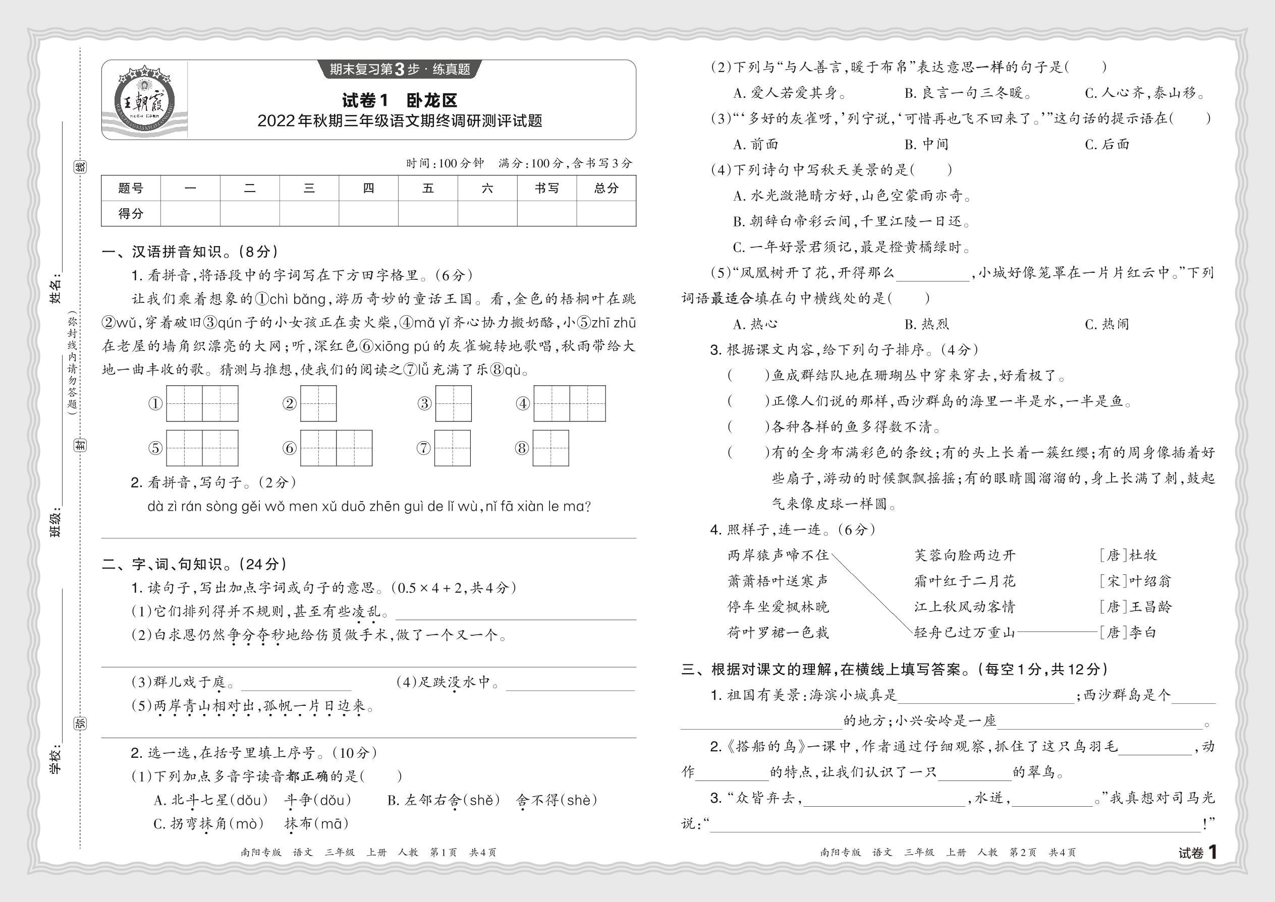 河南省南阳市卧龙区2022年秋期三年级语文期终调研测评试题(人教版)【1】