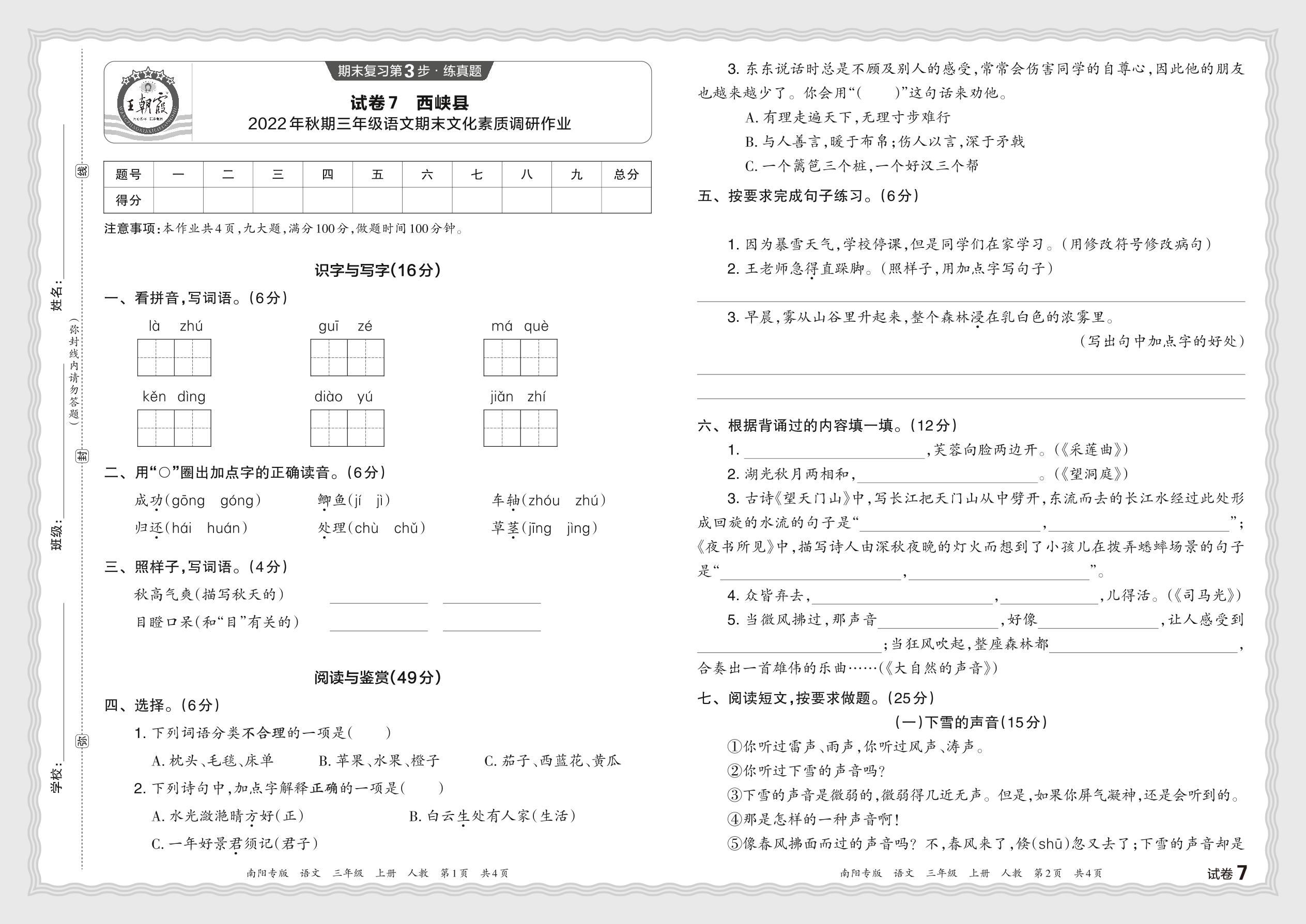 河南省南阳市西峡县2022年秋期三年级语文期末文化素质调研作业(人教版)【7】