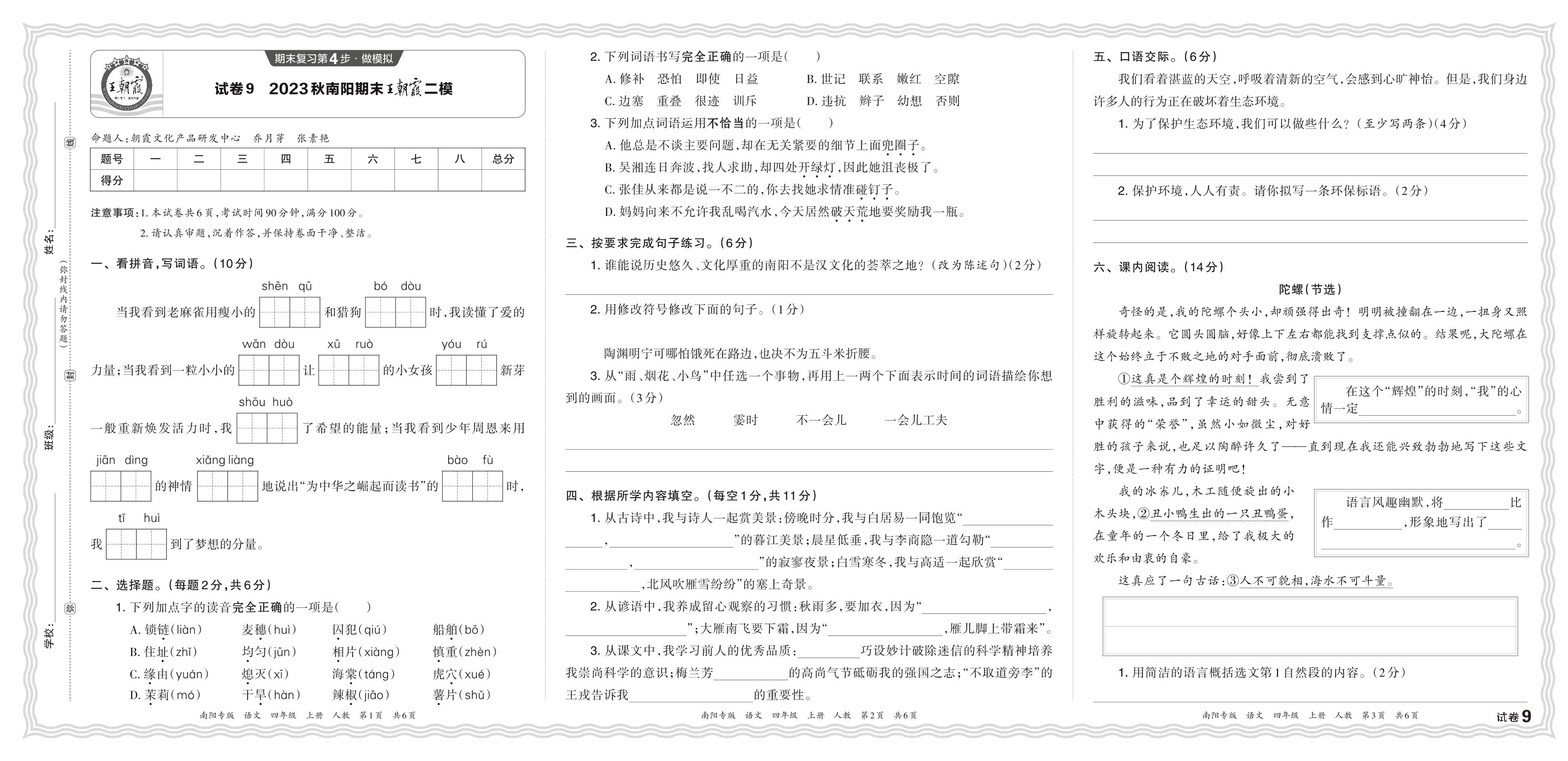 2023秋上册四年级语文人教版 河南南阳期末王朝霞二模【9】