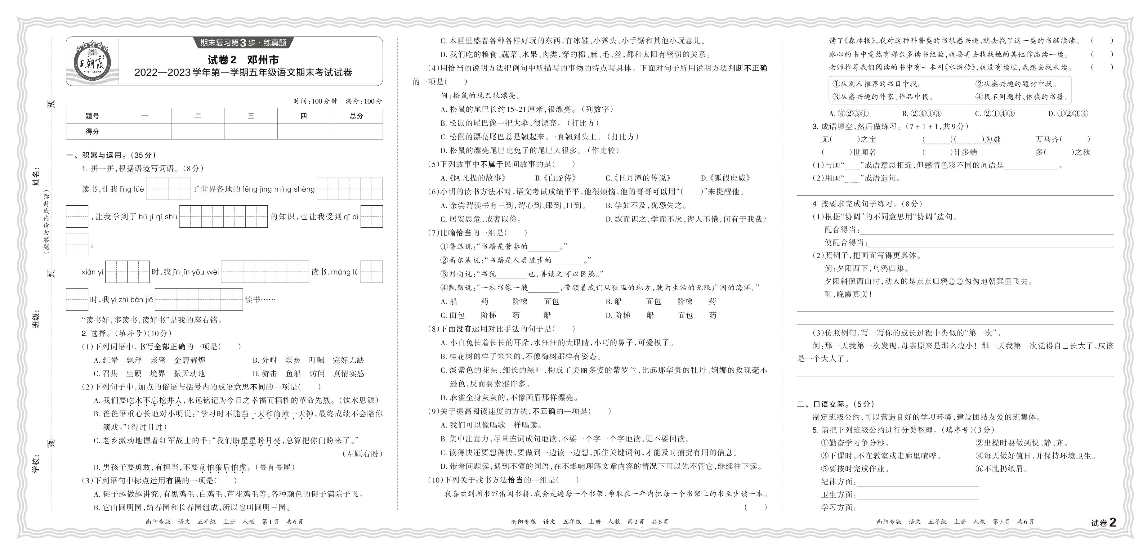 河南省南阳市邓州市2022-2023学年第一学期五年级语文期末考试试卷(人教版)【2】