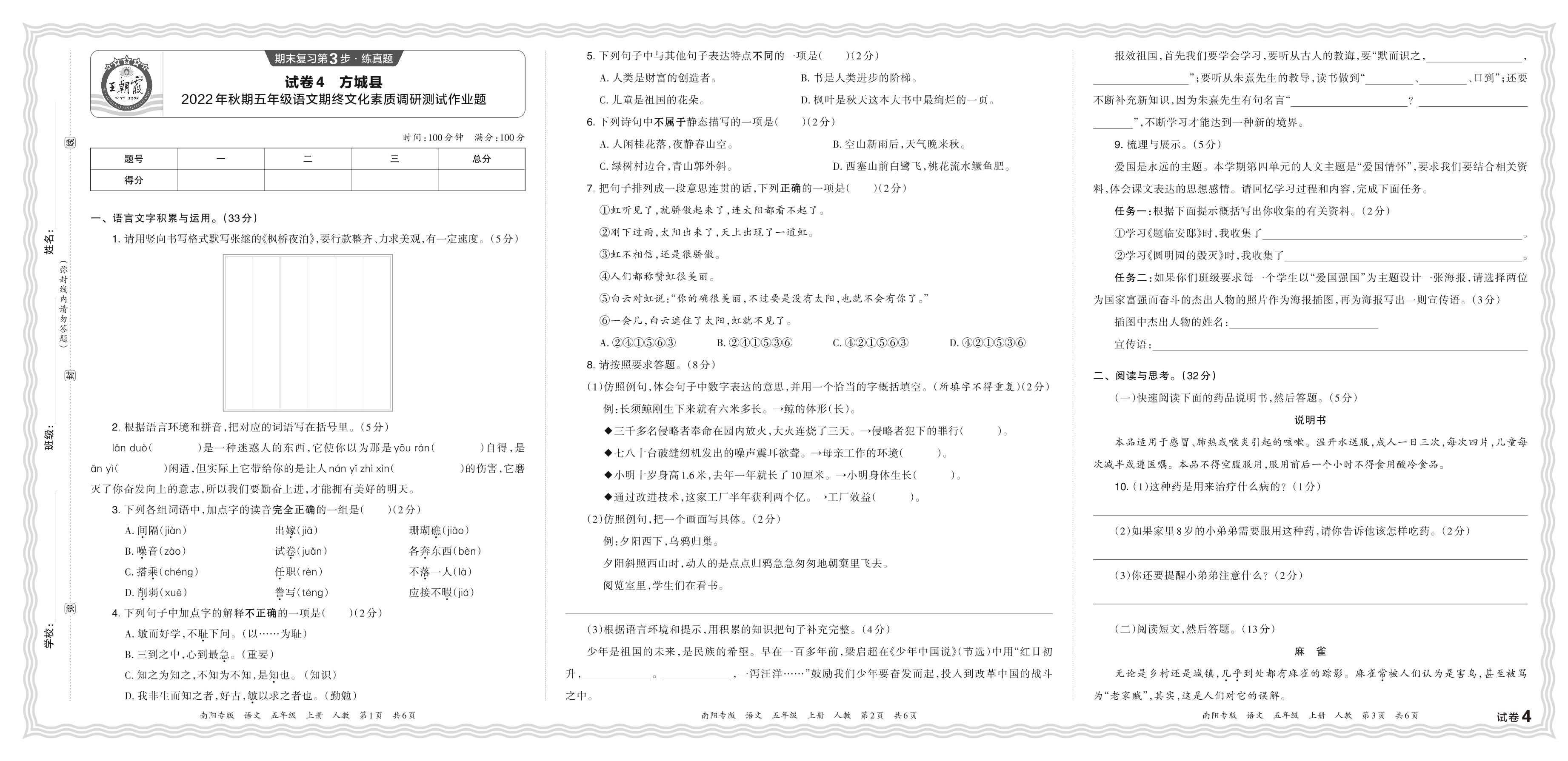 河南省南阳市方城县2022年秋期五年级语文期终文化素质调研测试作业题_(人教版)【4】