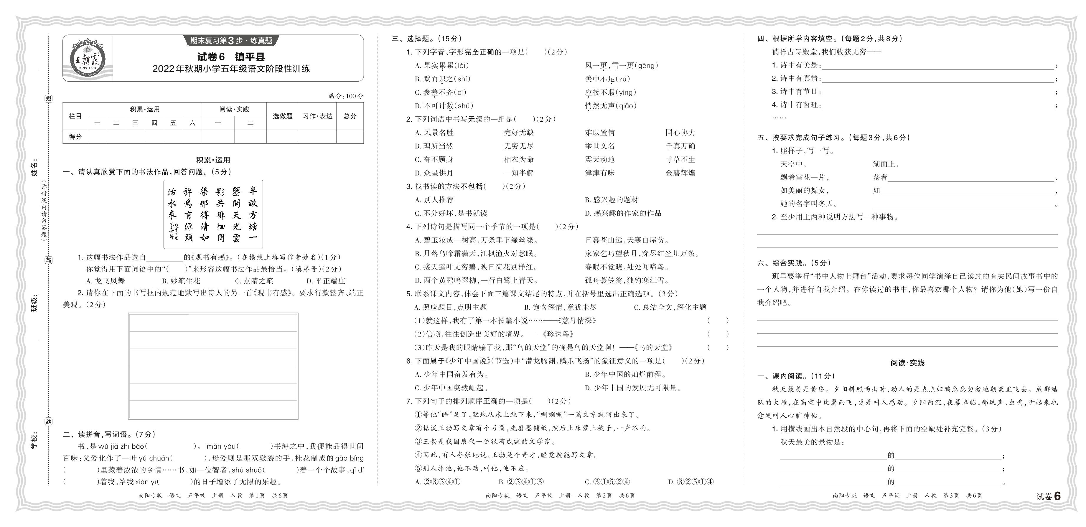 河南省南阳市社旗县2022—2023学年第一学期五年级语文综合素养作业(人教版)【6】