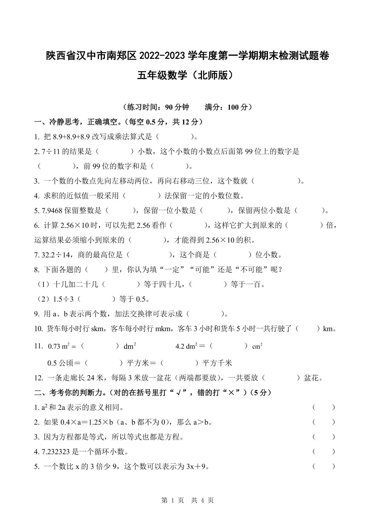 陕西省汉中市南郑区2022-2023学年度第一学期期末检测试题卷五年级数学(北师版)
