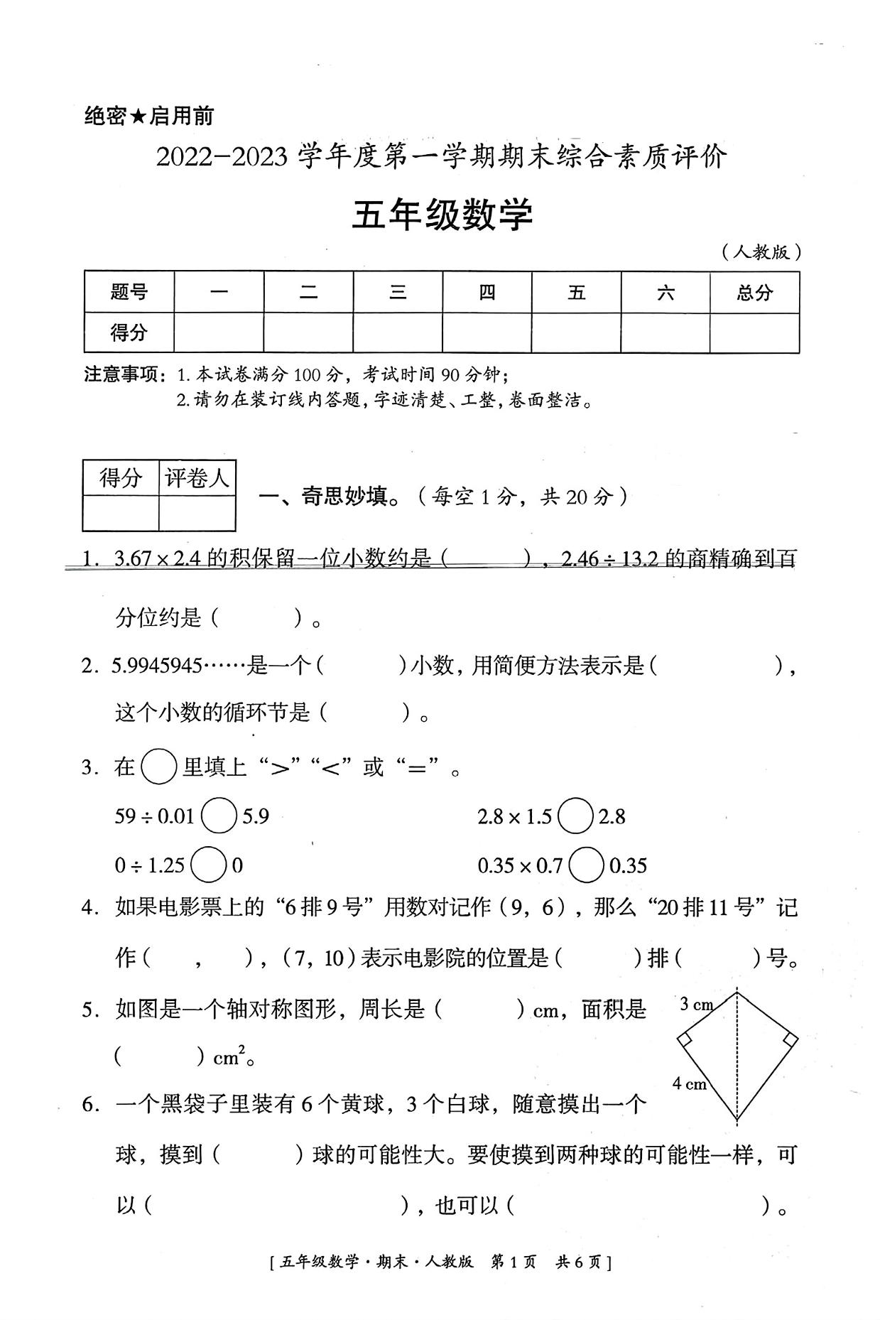 陕西省延安市富县2022-2023学年度第一学期期末综合素质评价五年级数学(人教版)
