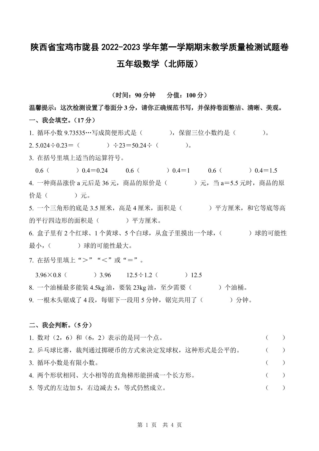 陕西省宝鸡市陇县2022-2023学年度第一学期期末教学质量检测试题卷五年级数学(北师版)