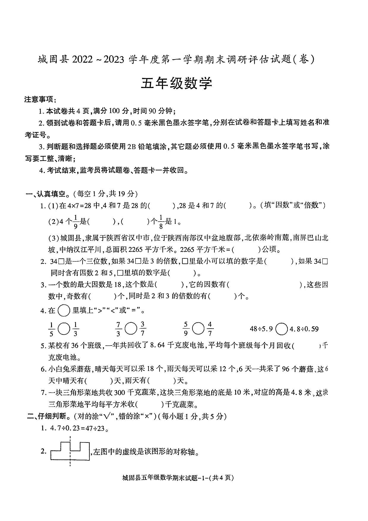 陕西省汉中市城固县2022-2023学年度第一学期期末调研评估试题卷五年级数学(北师版)
