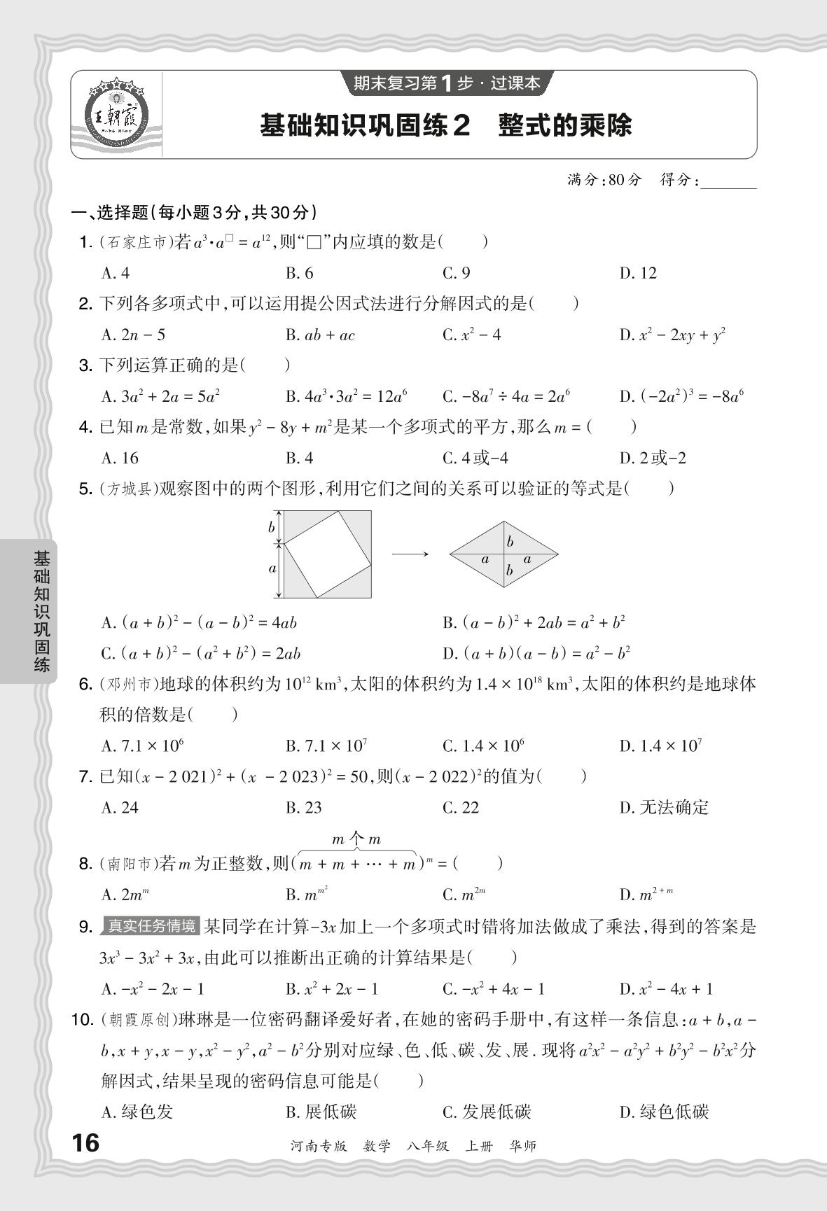 2023秋上册八年级数学华师版 期末过课本·基础知识巩固练 整式的乘除【2】