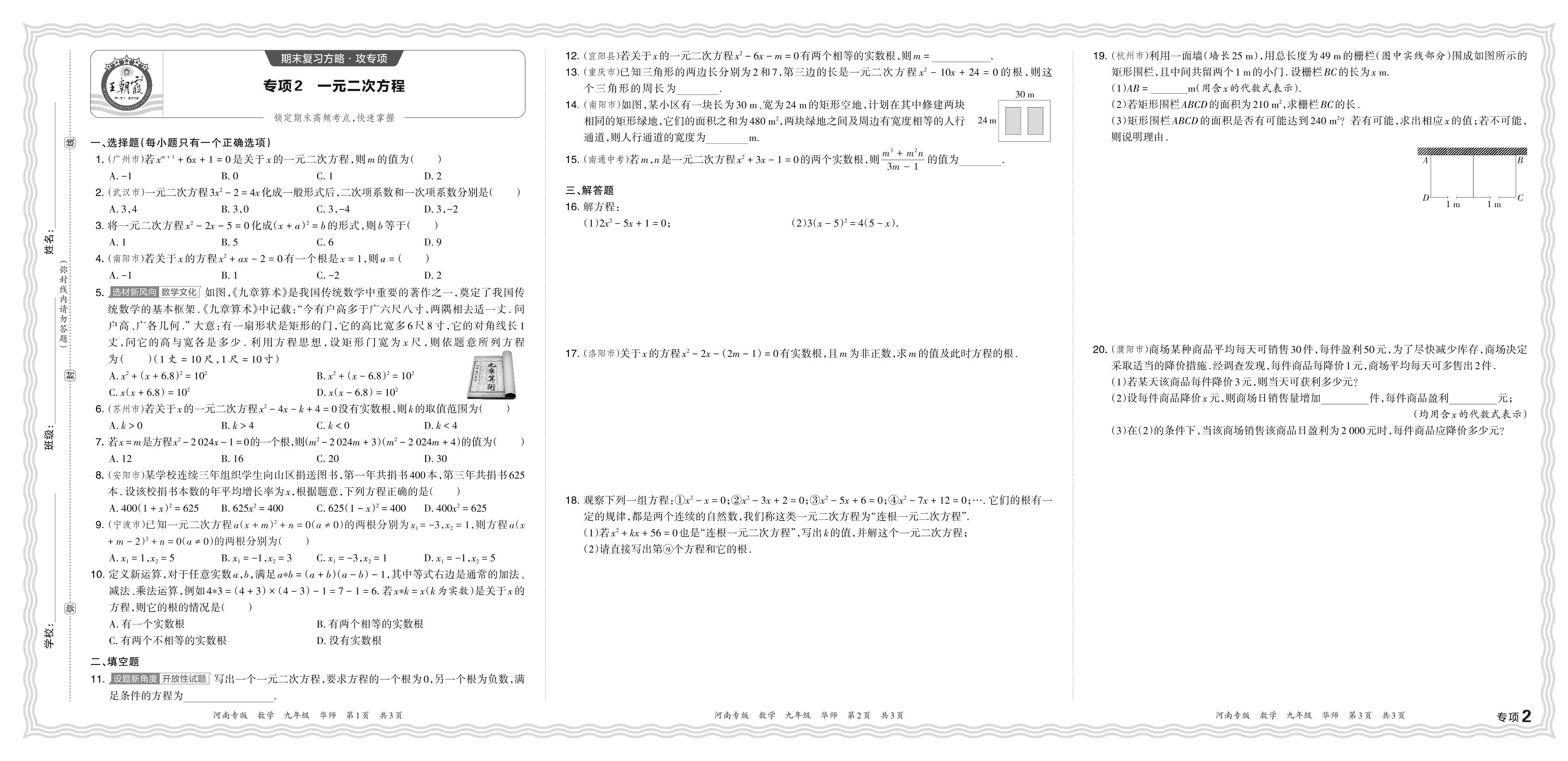 2023秋上册九年级数学华师版 期末专项卷·一元二次方程【2】