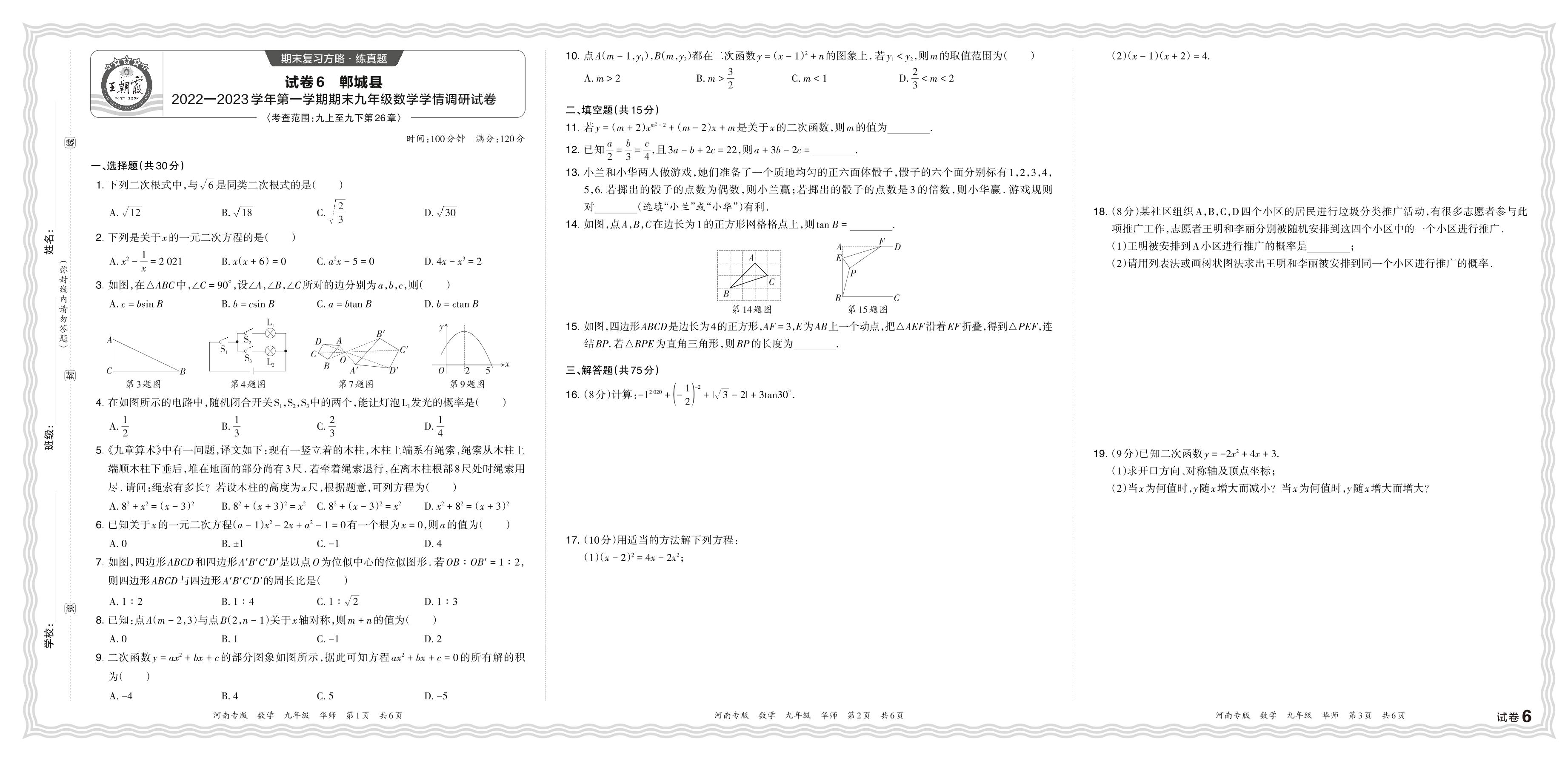 河南省周口市郸城县2022—2023学年第一学期期末九年级数学学情调研试卷(华师版)【6】