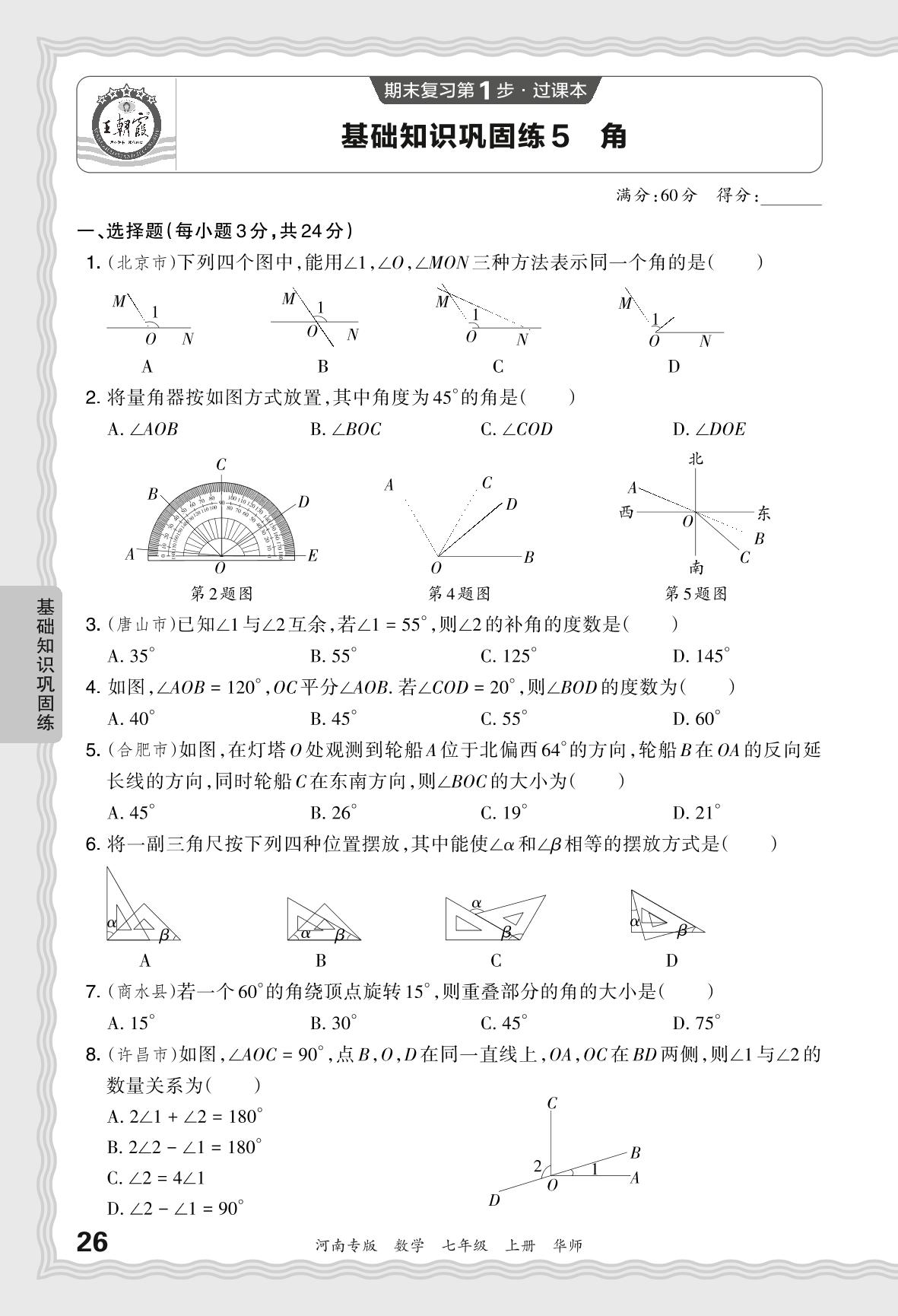 2023秋上册七年级数学华师版 期末过课本·基础知识巩固练 角【5】